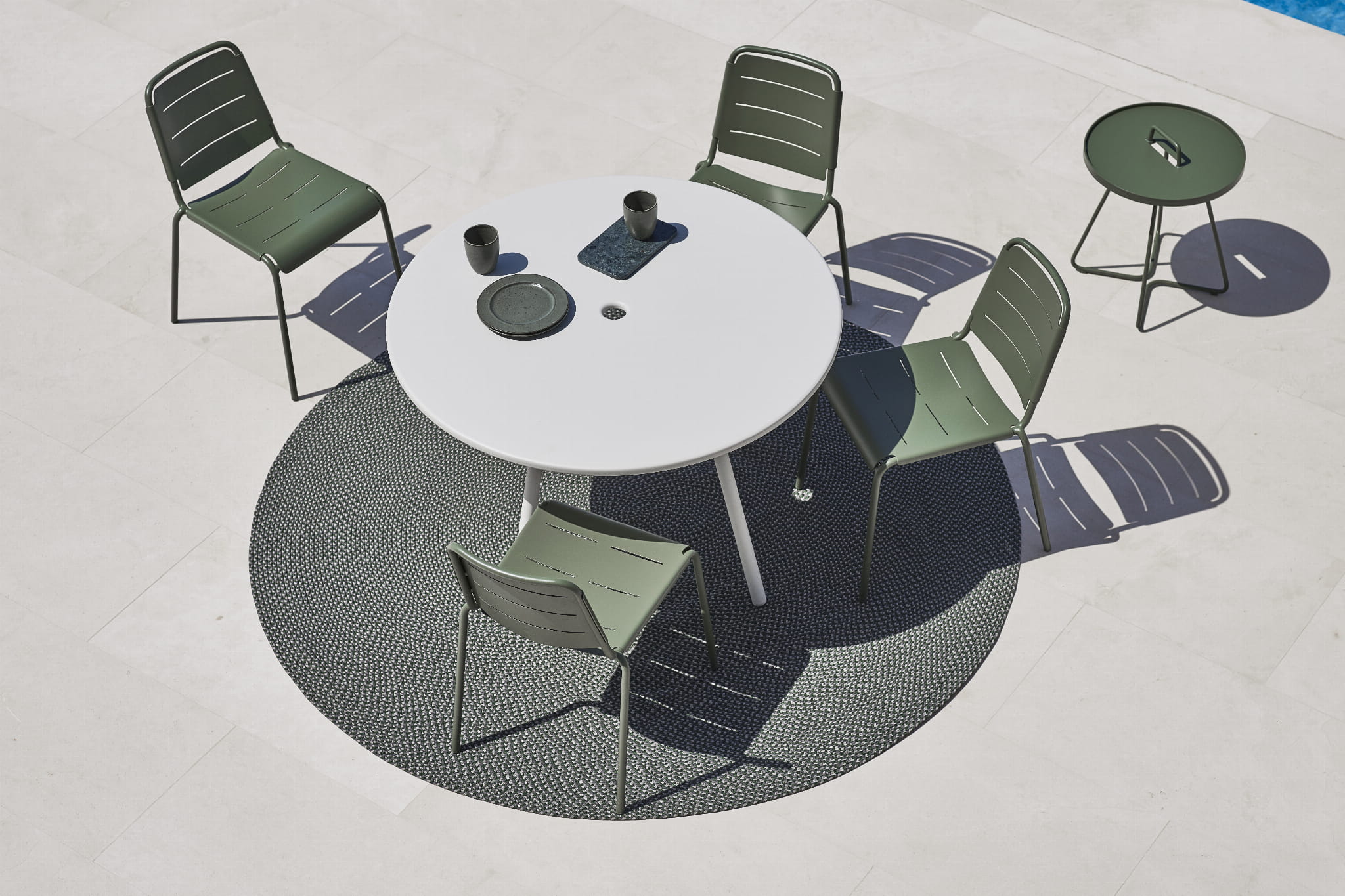 Stół ogrodowy AREA to elegancki okrągły aluminiowy stół jadalny o średnicy 110 cm. Oferuje minimalistyczny, funkcjonalny design bez zbędnych dodatków.