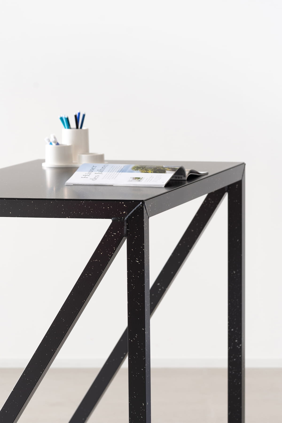 idealnie pasuje do stołków z serii BUREAURAMA. Stoliki w kolorze czarnym z plamami białymi dodają artystycznego