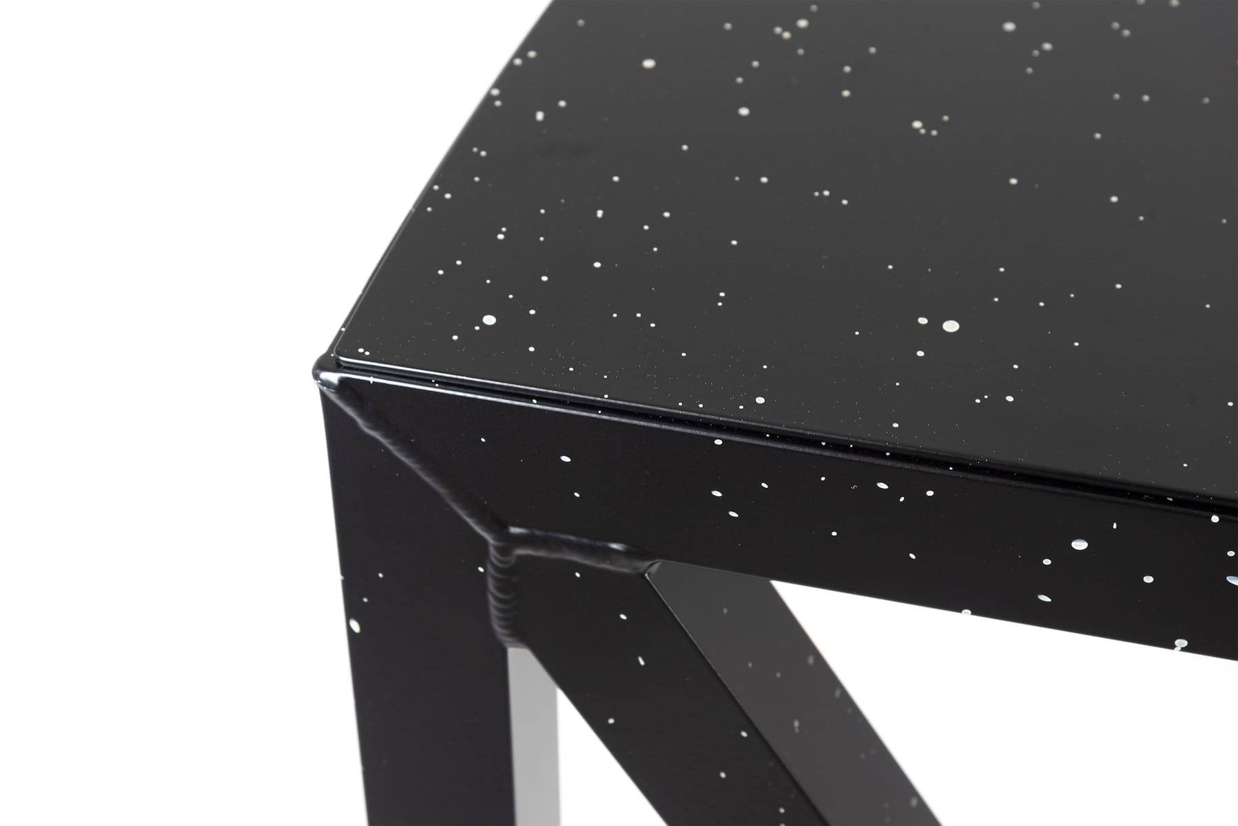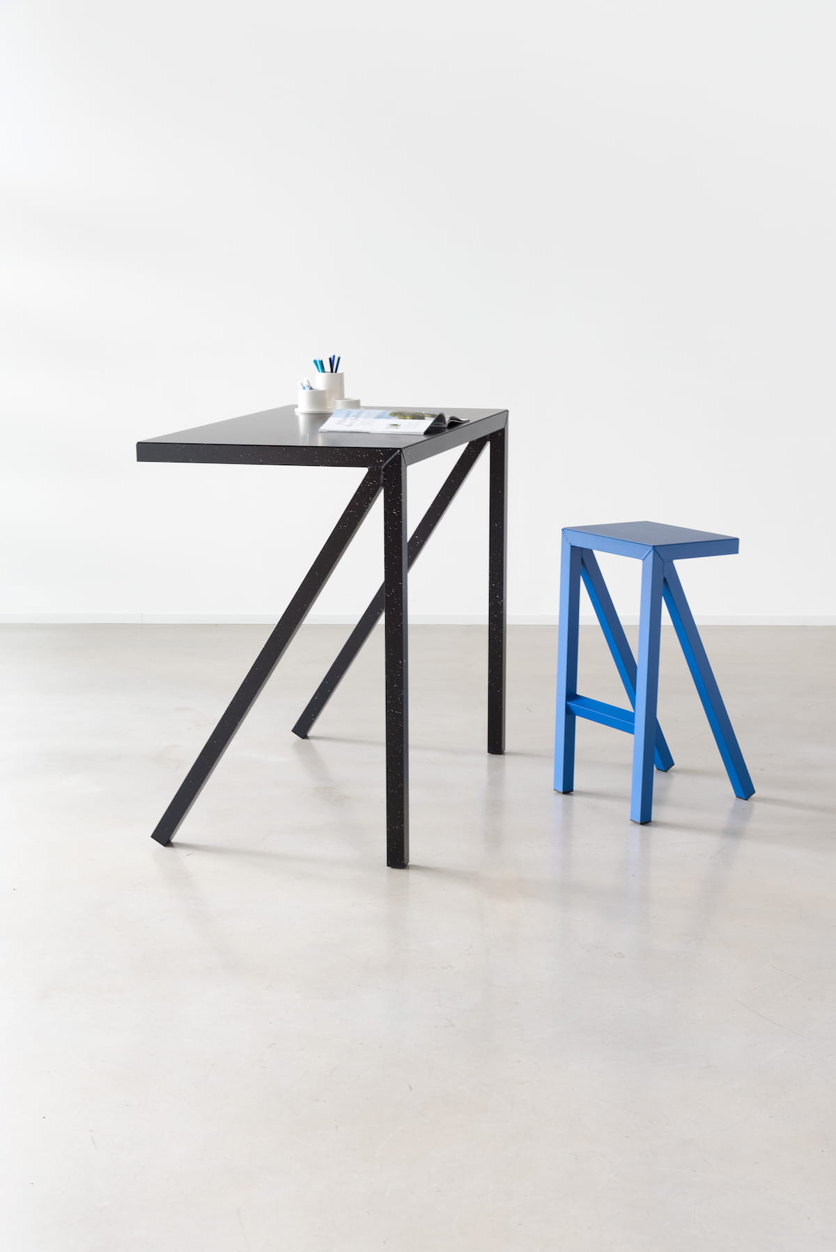 idealnie pasuje do stołków z serii BUREAURAMA. Stoliki w kolorze czarnym z plamami białymi dodają artystycznego