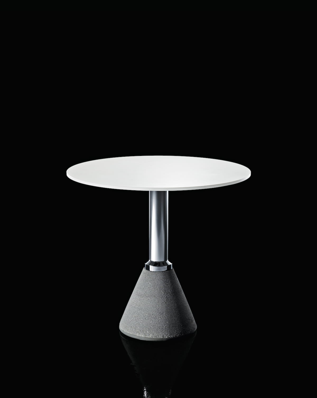 Betonowa baza pokryta jest czarną farbą, tak samo jak aluminiowa noga, blat stworzony z HPL również