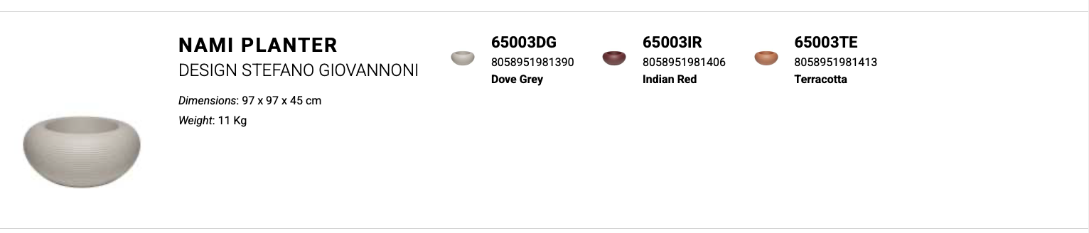Donica NAMI powstaje w wyniku rotacyjnego obrotu sekcji wokół przekątnej. Dzięki temu ma idealnie okrągły kształt, a żłobienia charakteryzujące jego powierzchnię rozchodzą się od środka do krawędzi tworząc sekwencję koncentrycznych pierścieni.