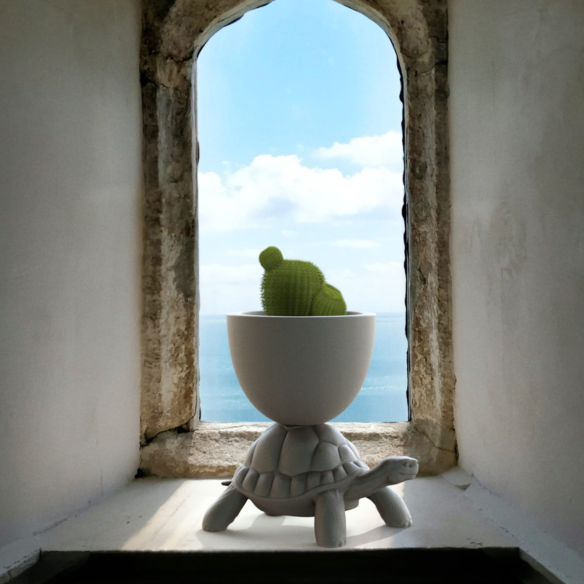 Rezultatem jest rodzina produktów, które dzielą tę samą podstawę - żółwia - niosącego kolejno: regał, stolik kawowy, pufę lub donicę. Projektant po raz kolejny inspirował się światem przyrody i jego dziwacznymi formami i przełożył je na artystyczne koncepcje, które mogą wprowadzić do naszych domów wyrafinowaną ironię.