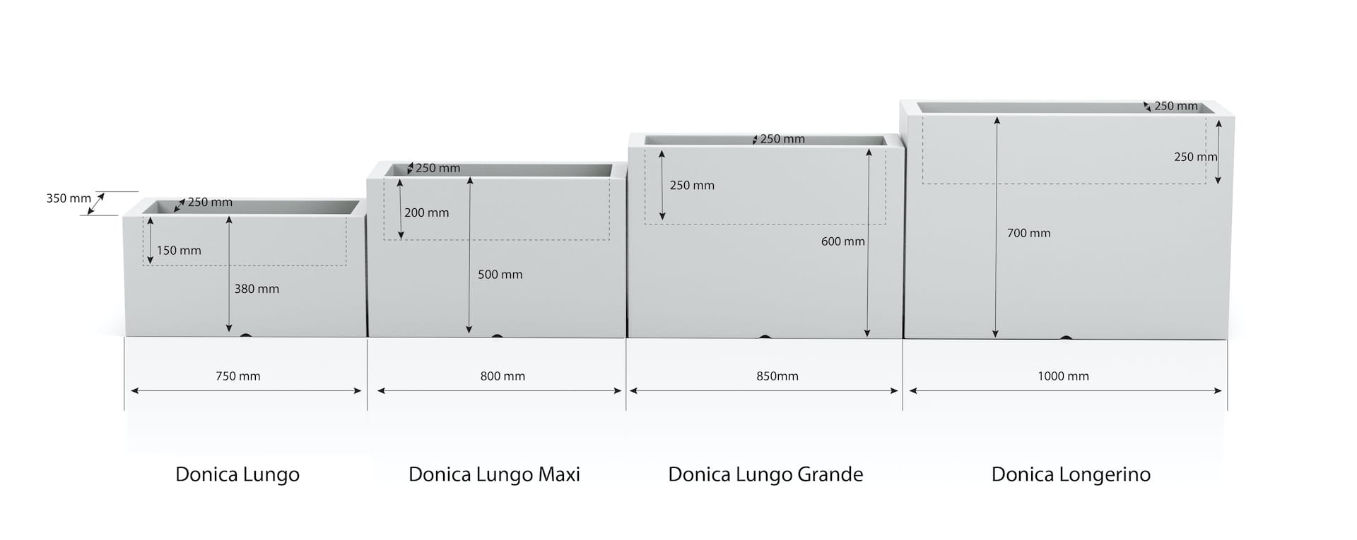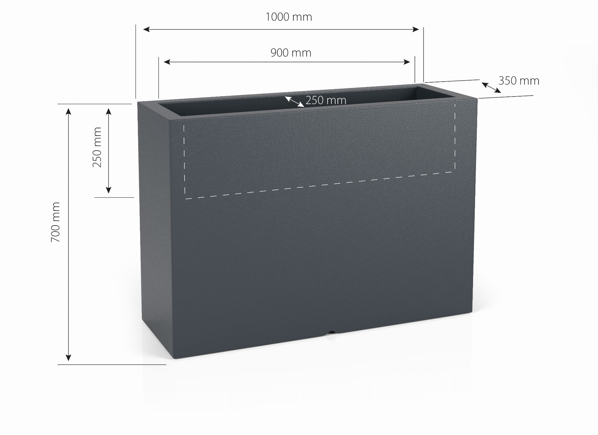 | Donica Longerino | 70 cm | 100 cm x 35 cm | 17,5 kg | 25 cm | Polietylen PE | -40°C / +60°C / UV | do wnętrz i na zewnątrz |