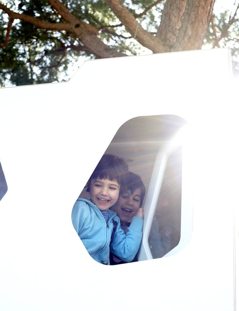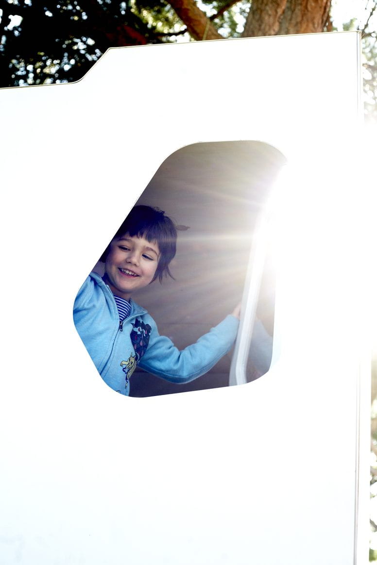 Domek ma jedne drzwi ze specjalnie zaprojektowanymi uchwytami z ochroną palców w obszarze zawiasów, 2 otwierane okna i 13 okien stacjonarnych.