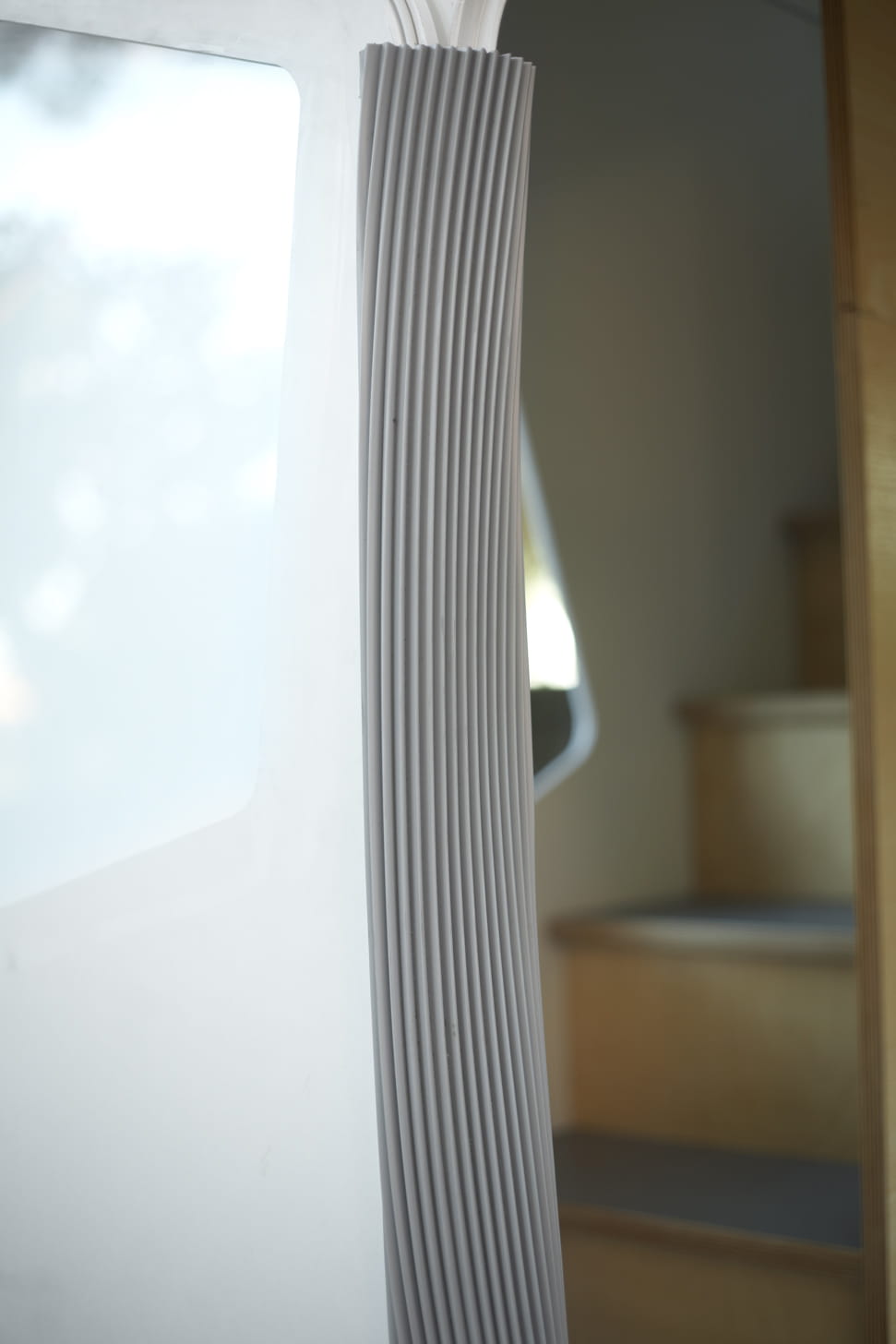Dach tego dwupiętrowego budynku jest wykonany ze sklejki brzozowej o grubości 18 mm i ma izolację termiczną (Rockwool) i prefabrykowany wodoodporny materiał gumowy EPDM z wbudowaną rurką odprowadzającą wodę, aby zagwarantować całkowite wodoszczelne zamknięcie.