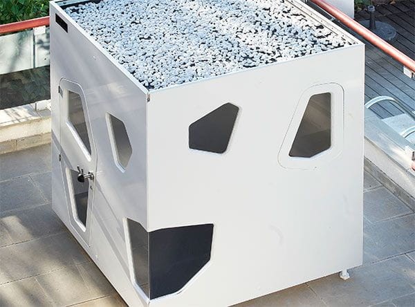 Dach tego budynku jest wykonany ze sklejki brzozowej o grubości 18 mm i ma izolację termiczną (Rockwool) i prefabrykowany wodoodporny materiał gumowy EPDM z wbudowaną rurką odprowadzającą wodę, aby zagwarantować całkowite wodoszczelne zamknięcie.