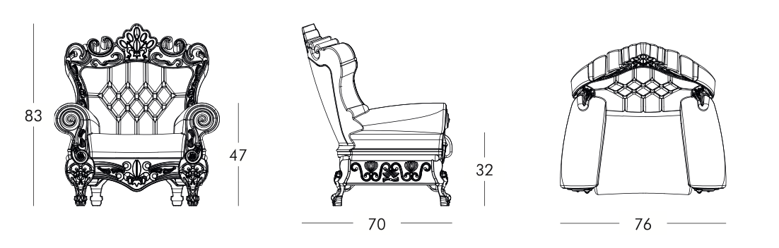 Fotel zachowuje te same bogate zdobienia i detale co większy. Barokowy styl zachowany w bryle z polietylenu sprawia, że mała wersja fotela