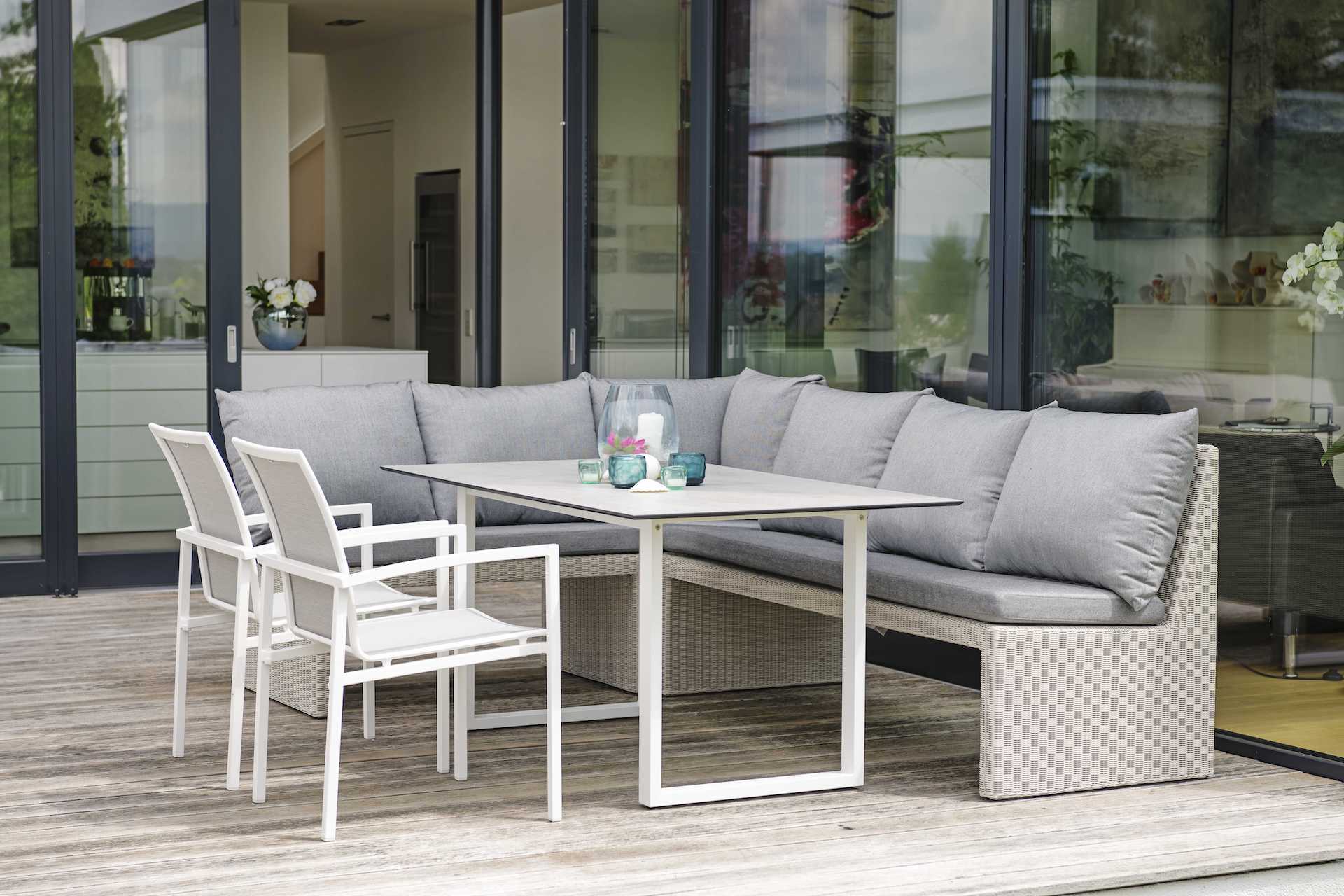 Dzięki elementowi narożnemu NOEL można zbudować narożnik idealny do wspólnego biesiadowania przy stołu w ogrodzie.