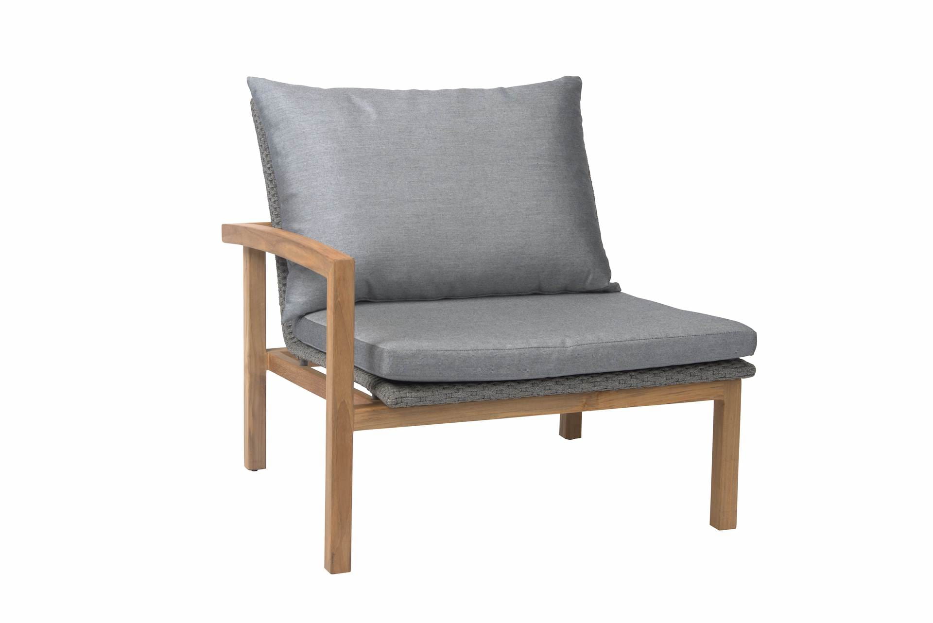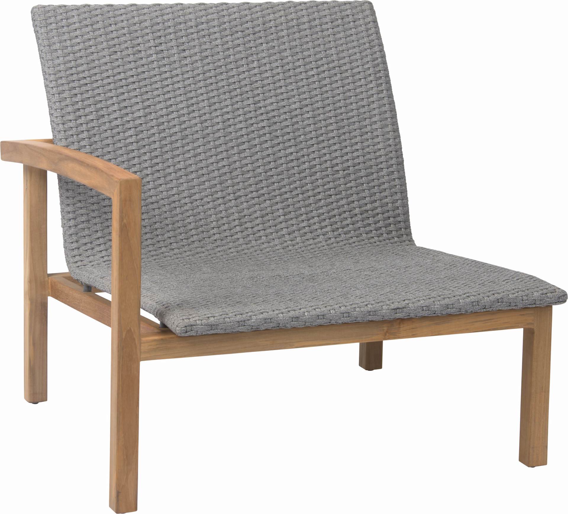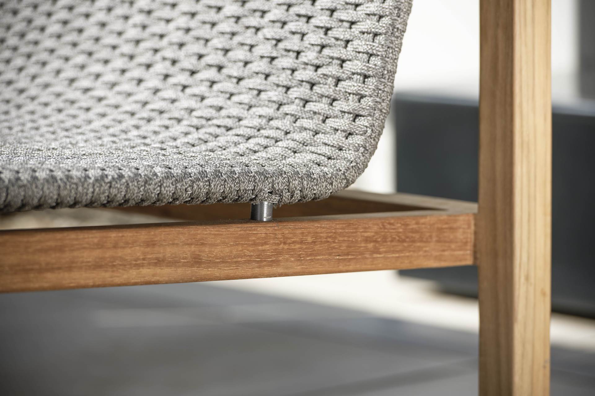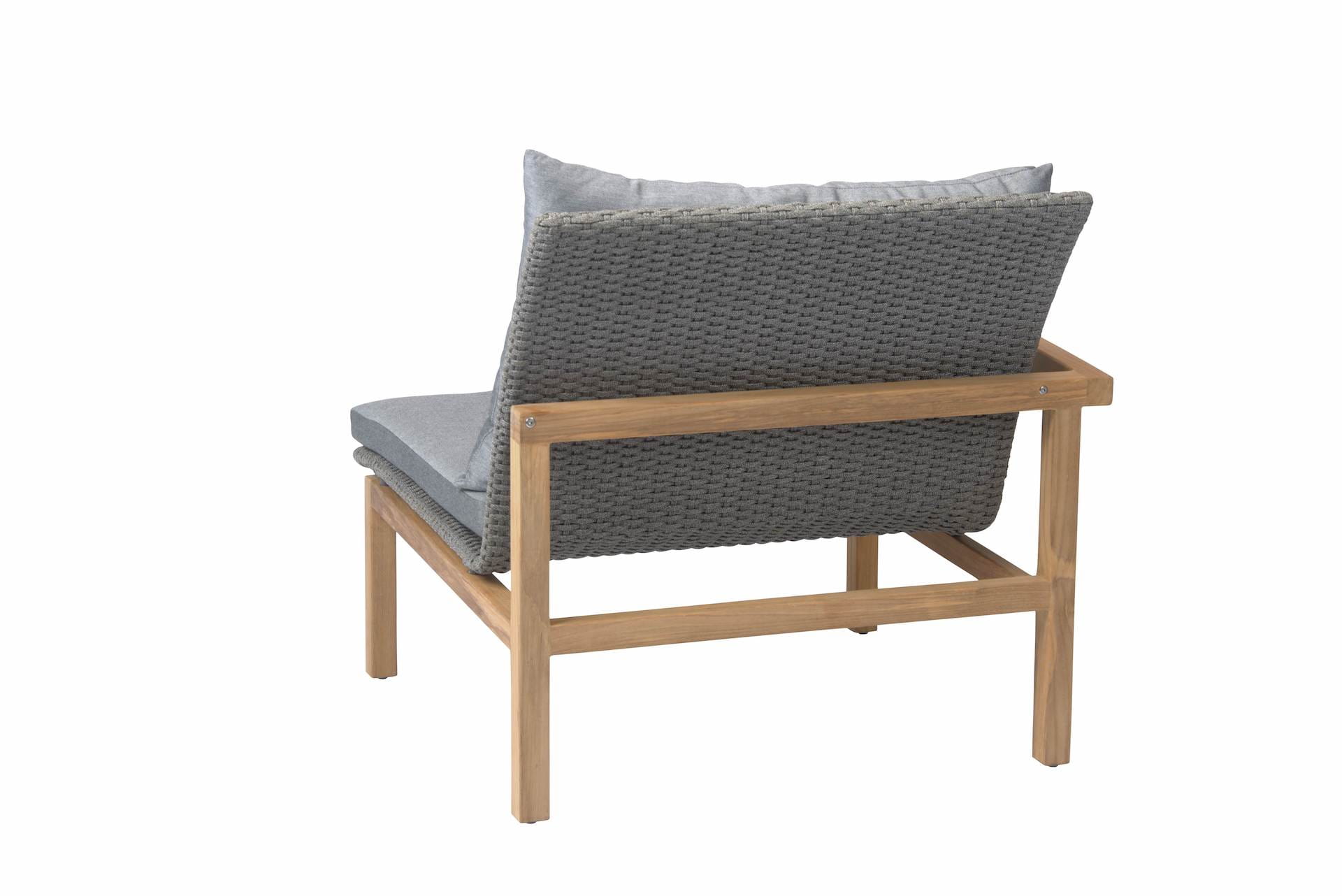 Element prawy LEAH posiada stabilną, drewnianą ramę i plecione siedzisko z syntetycznego sznurka w kolorze szarym.