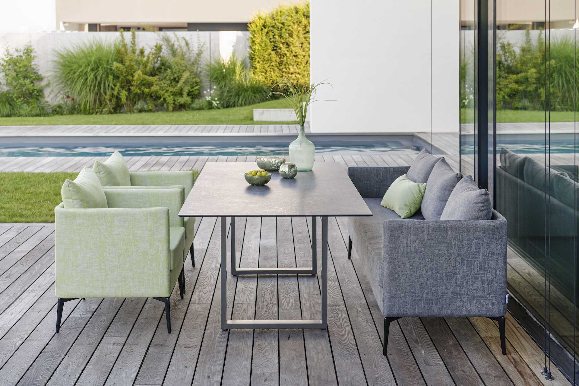 Marta to meble tapicerowane wykonane z wysokiej jakości, miękkiej tkaniny (100% poliakryl) na aluminiowym stelażu.
