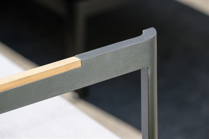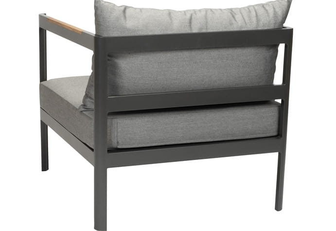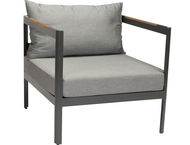 Fotel ogrodowy VIGGO charakteryzuje się pienym detalem w postaci zaokrąglonych ram oraz dodatkowem drewna teak, które 'ociepla' formę.