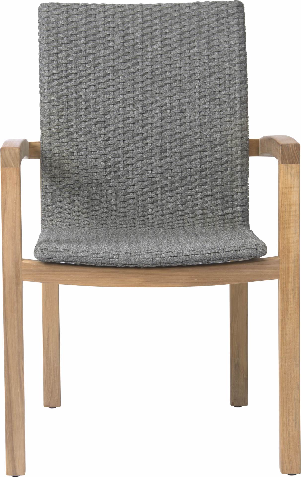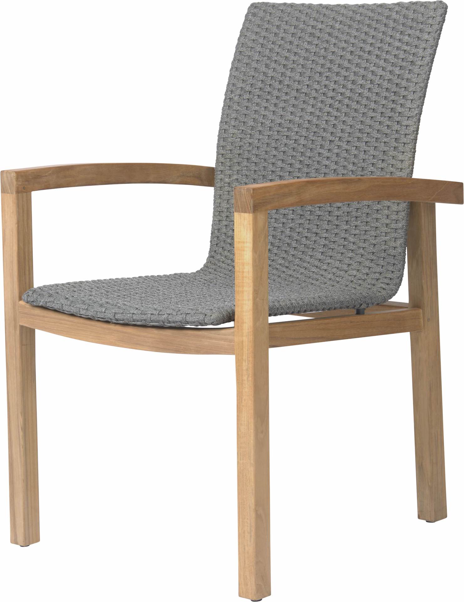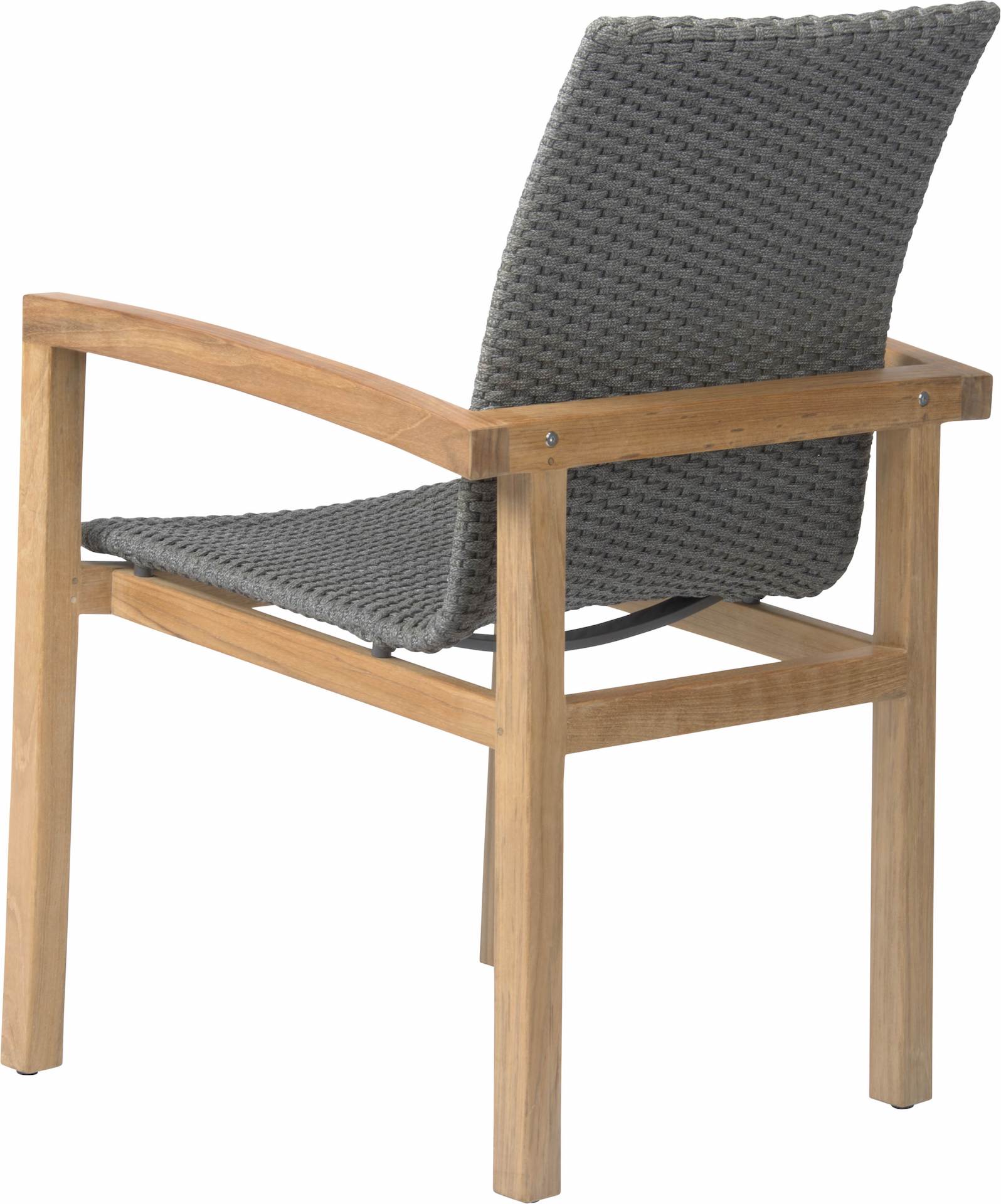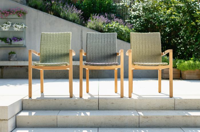Krzesło ogrodowe LEAH posiada stabilną, drewnianą ramę i plecione siedzisko z syntetycznego sznurka.