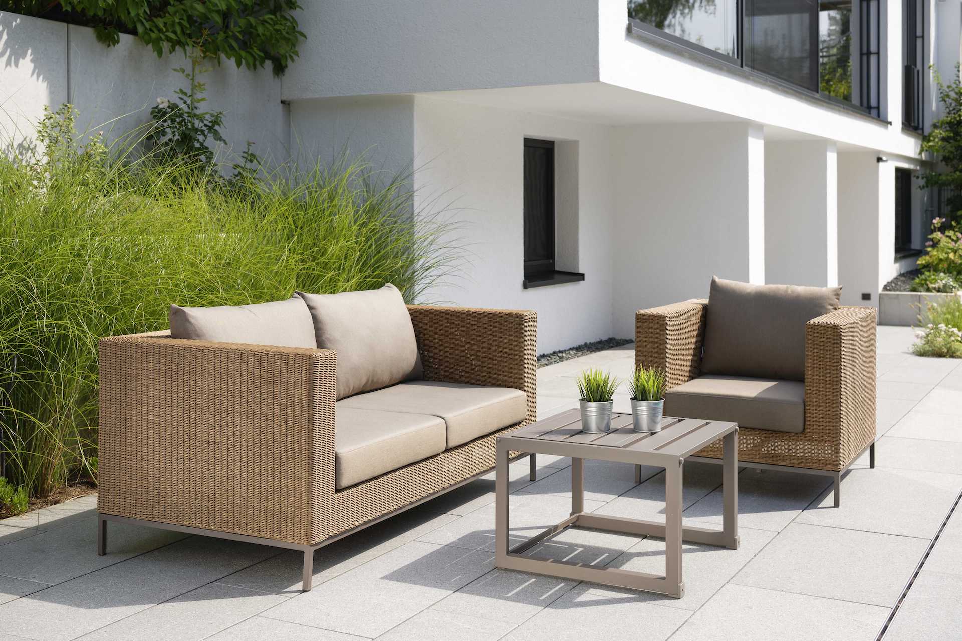 Połączenie minimalistycznego designu z tradycyjnym materiałem w nowoczesnym wydaniu jakim jest eko-wiklina sprawia, że zestaw mebli ogrodowych FONTANA to idealna propozycja na niejeden taras czy ogród.