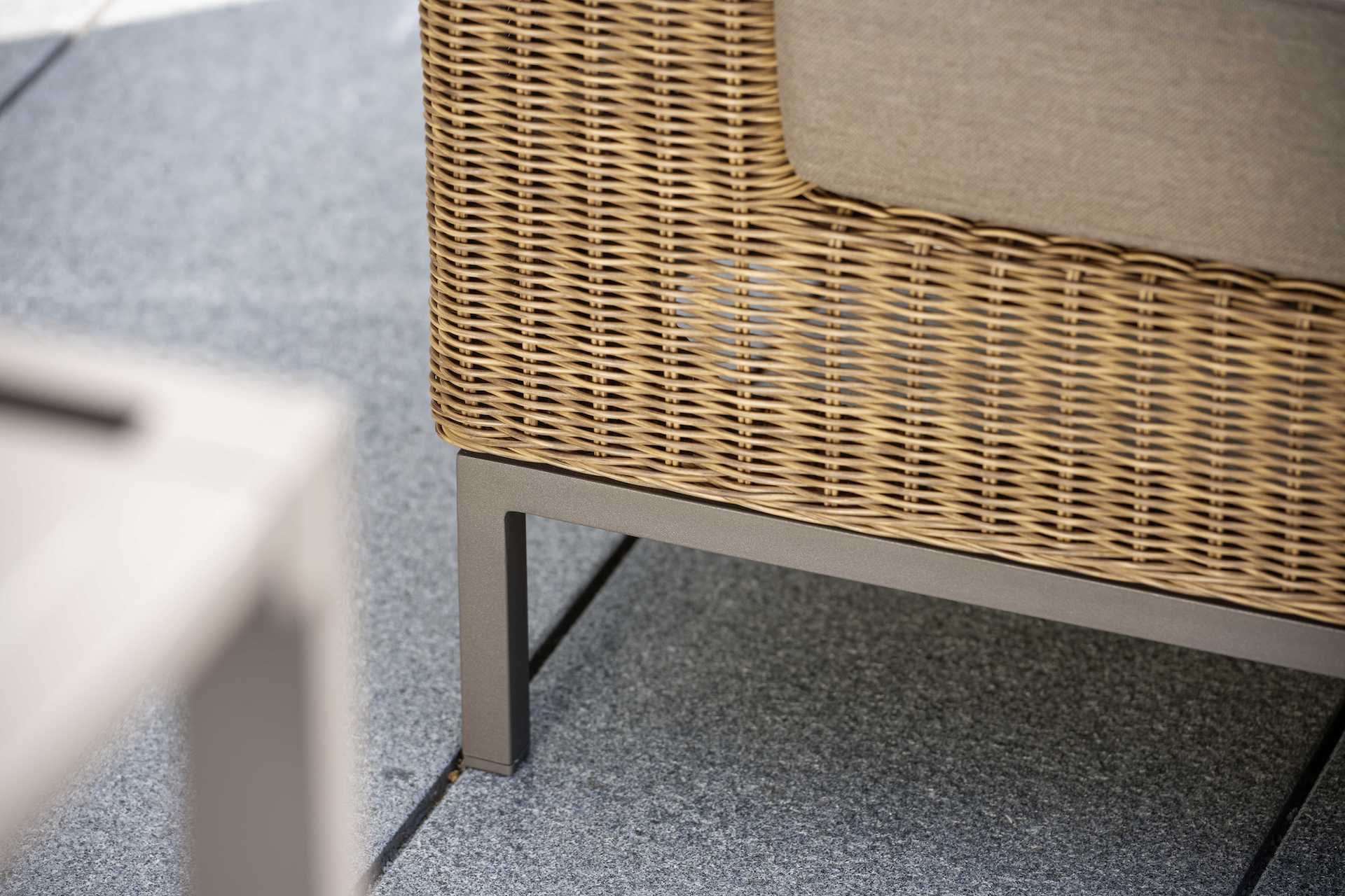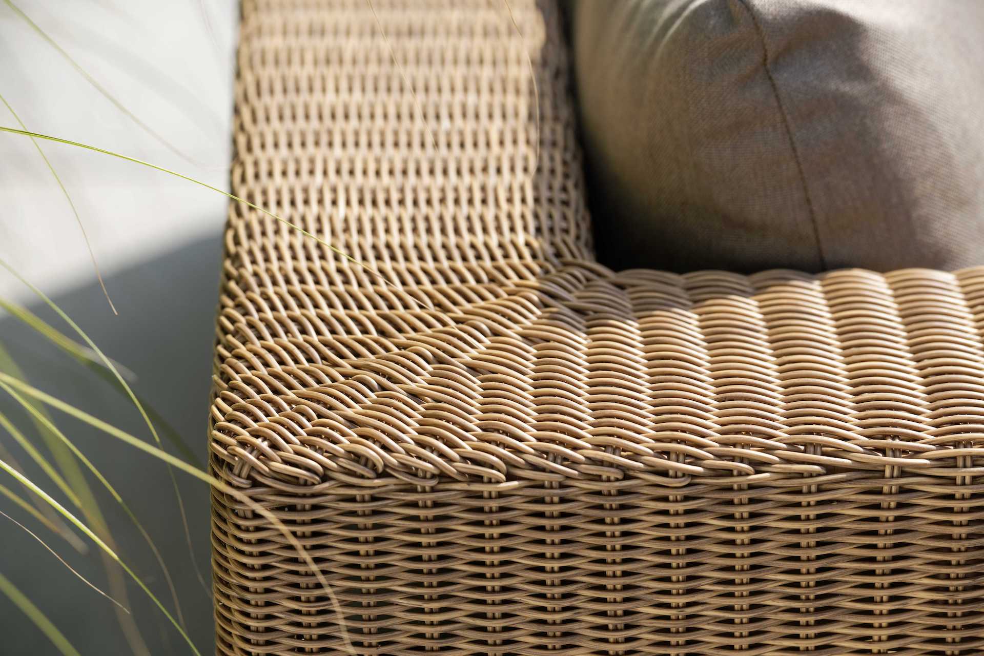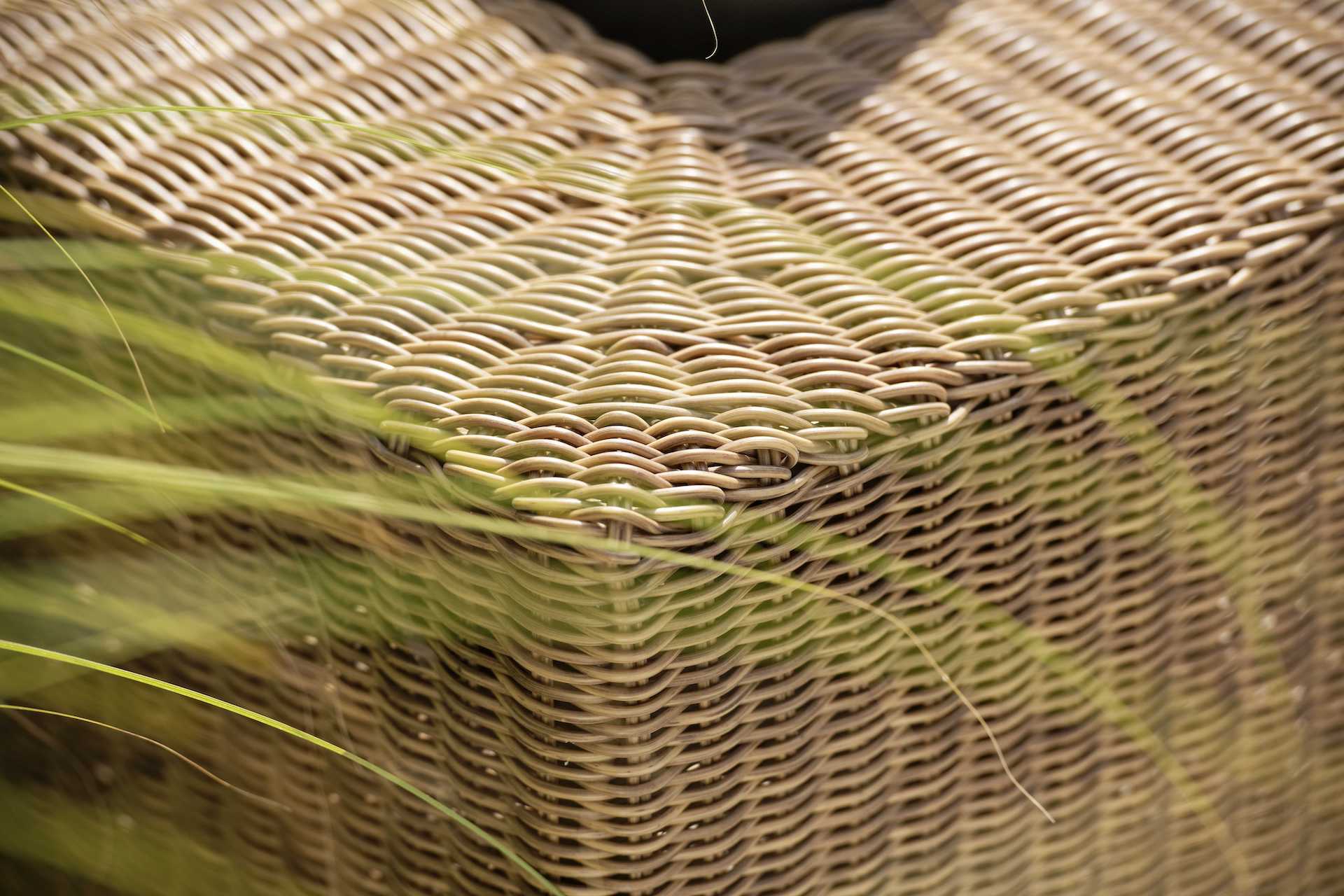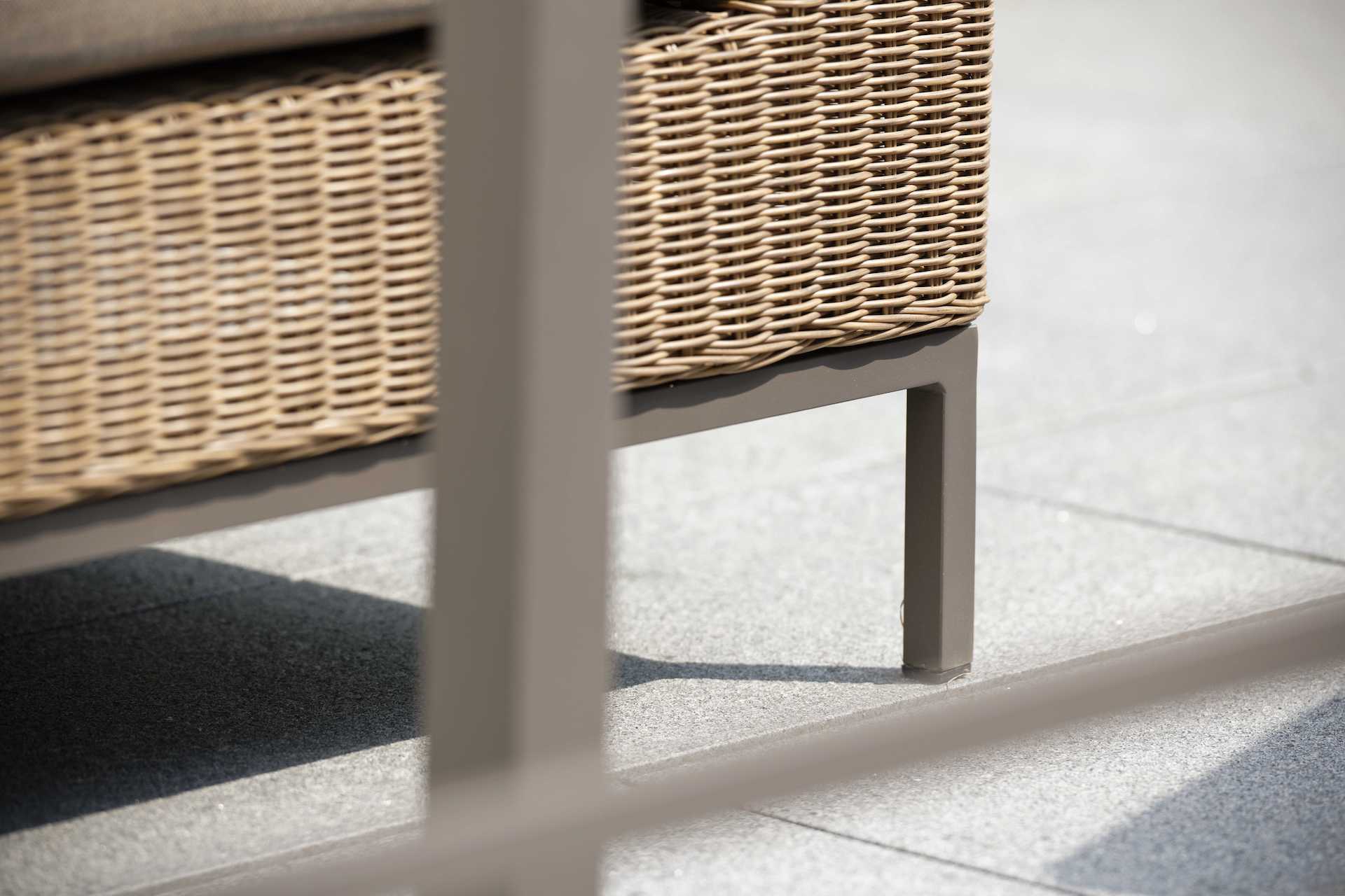 Ręczne oplatanie na solidnych, malowanych proszkowo aluminiowych ramach sprawia, że te meble ogrodowe są trwałe i unikalne.