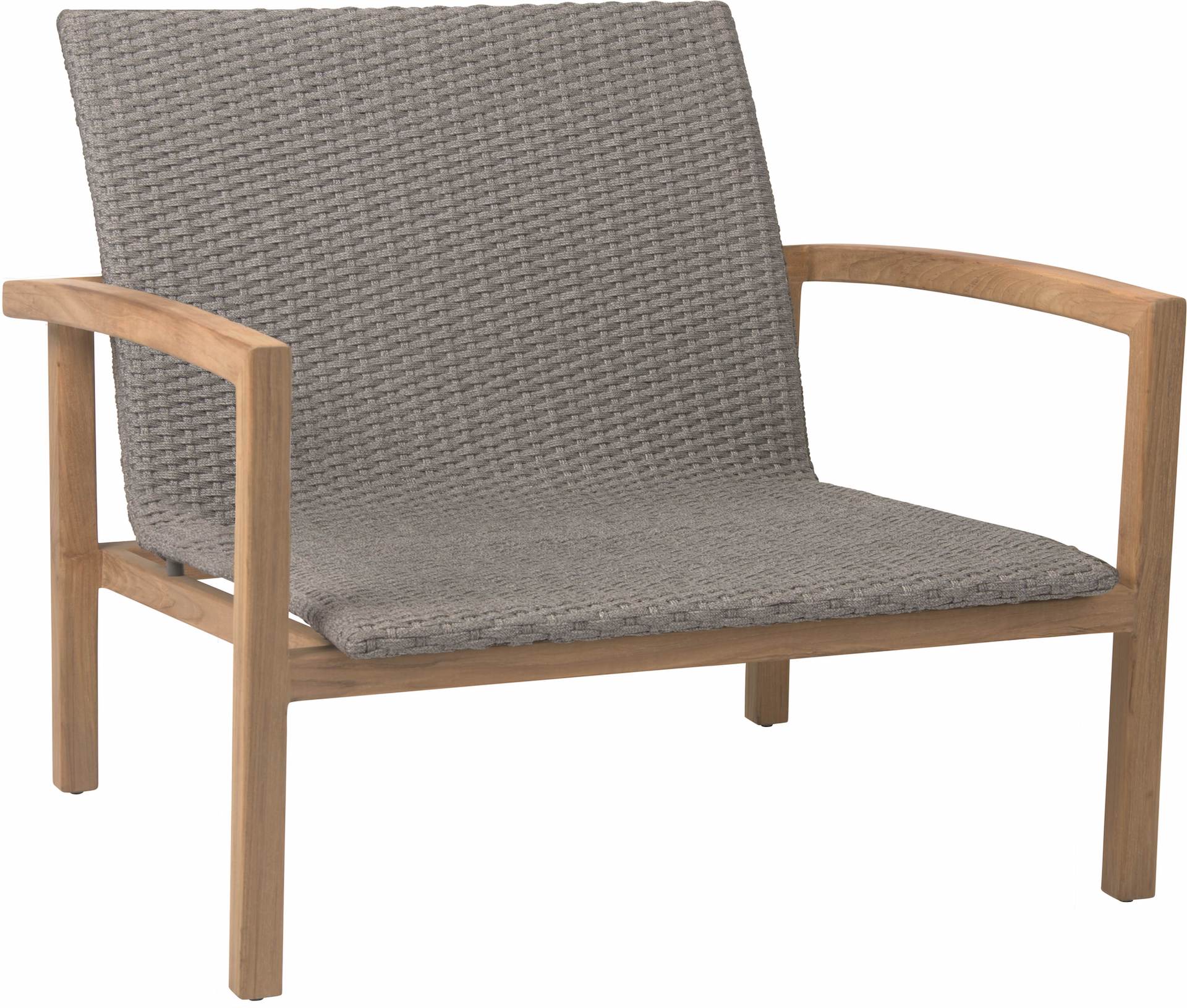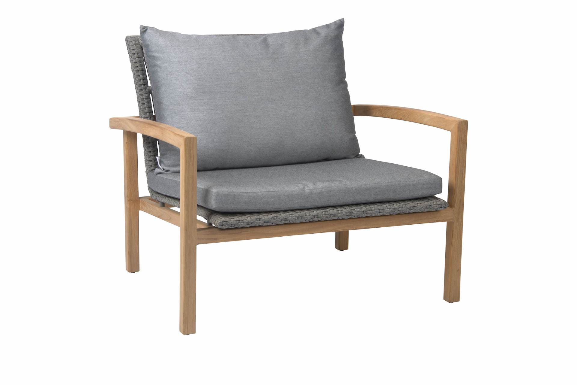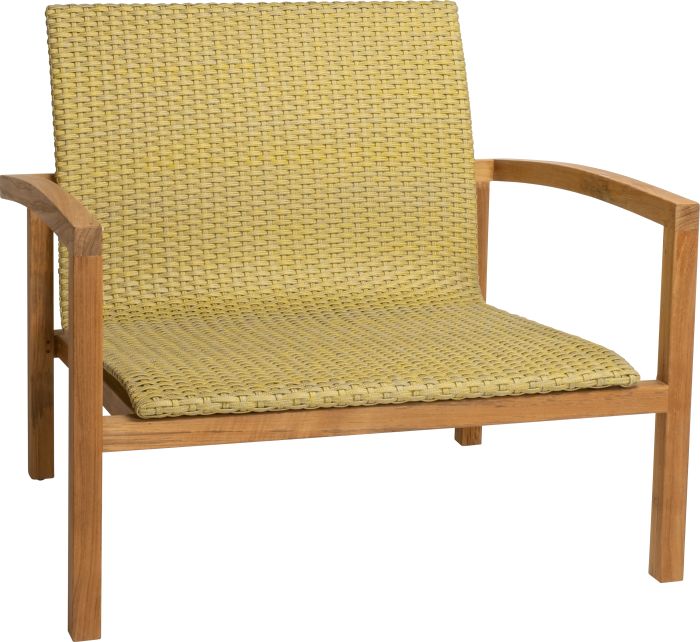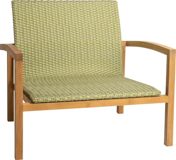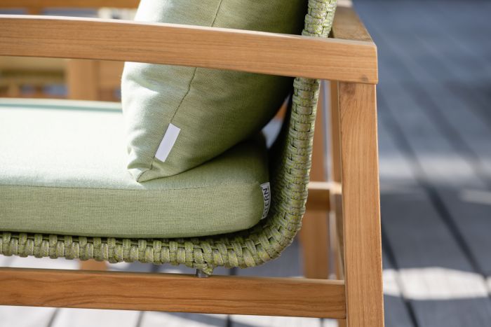 Fotel wypoczynkowy LEAH posiada stabilną, drewnianą ramę i plecione siedzisko z syntetycznego sznurka w kolorze szarym, żółtym lub zielonym.