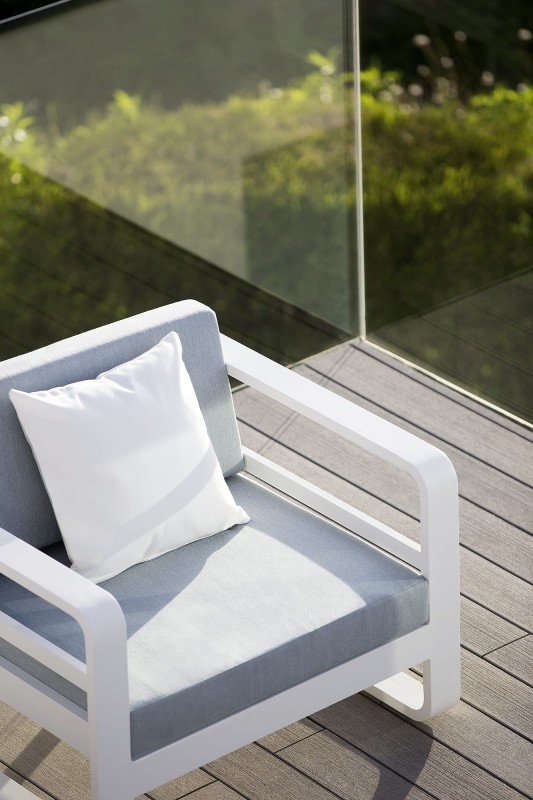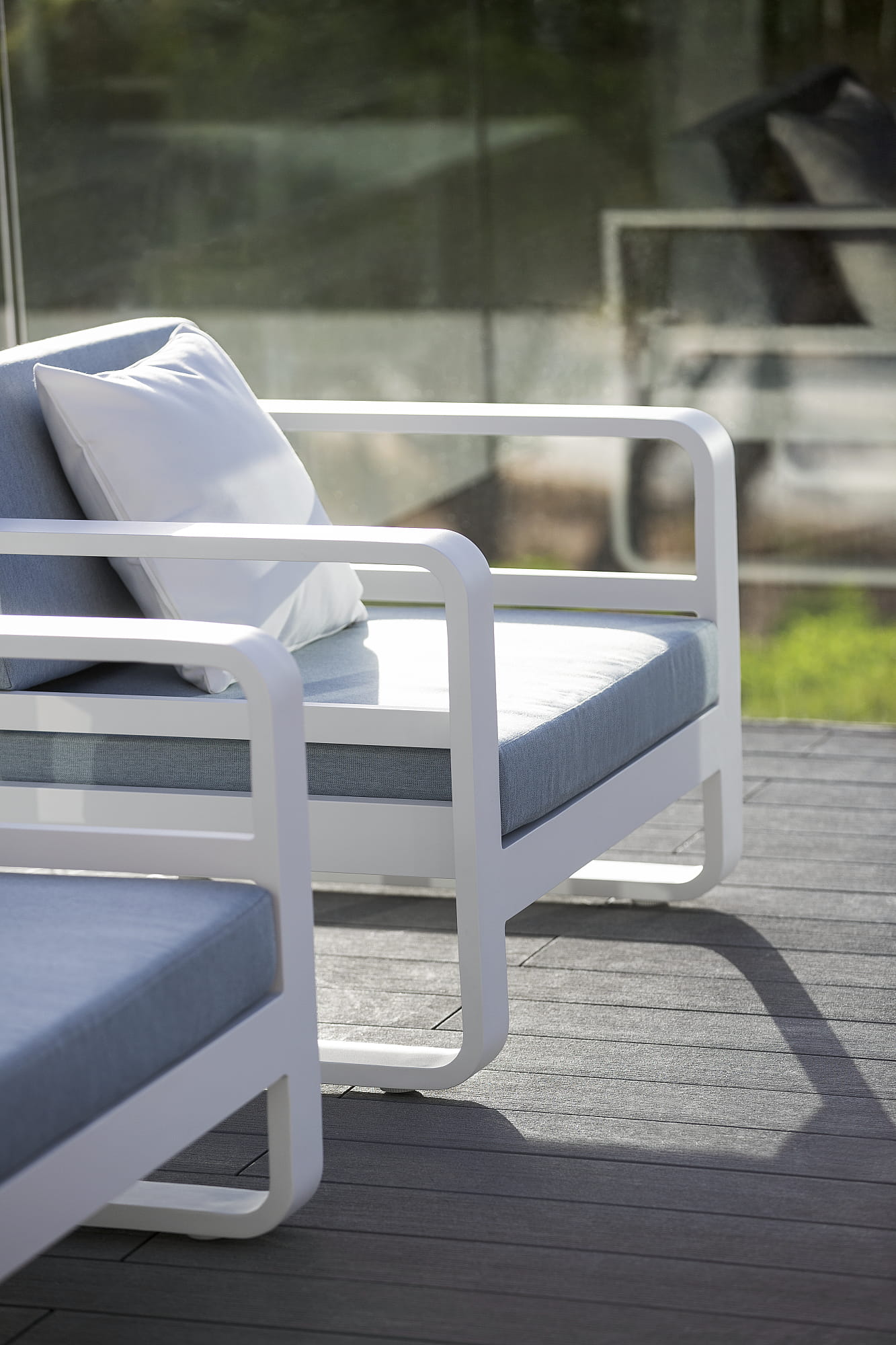 Zakrzywione linie ramy i świeże akcenty wygodnych poduszek ogrodowych dobrze komponują się z każdym otoczeniem.