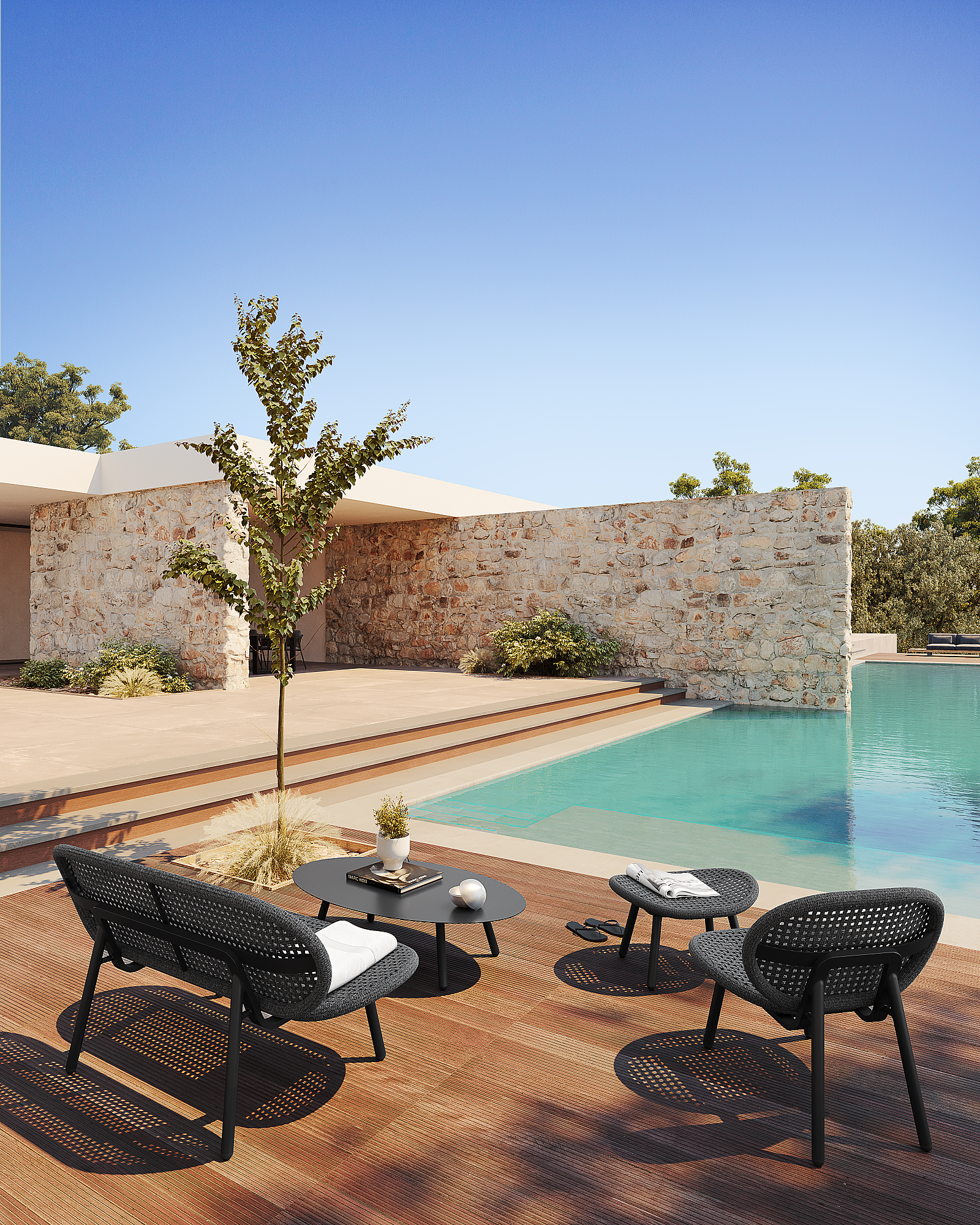 Aluminiowa rama malowana proszkowo oraz wykończenie liną poliolefinową sprawiają, że meble są trwałe, odporne na warunki zewnętrzne i warunki atmosferyczne.