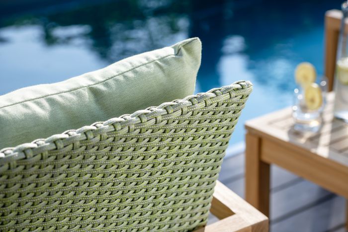 Fotel wypoczynkowy LEAH posiada stabilną, drewnianą ramę i plecione siedzisko z syntetycznego sznurka w kolorze szarym, żółtym i zielonym.