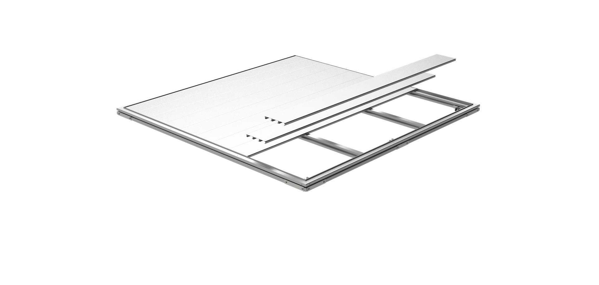 W skład zestawu wchodzi wysokiej jakości podłoga aluminiowa z blachy ryflowanej o grubości 2 mm, specjalna rama fundamentowa oraz nóżki z regulacją wysokości.