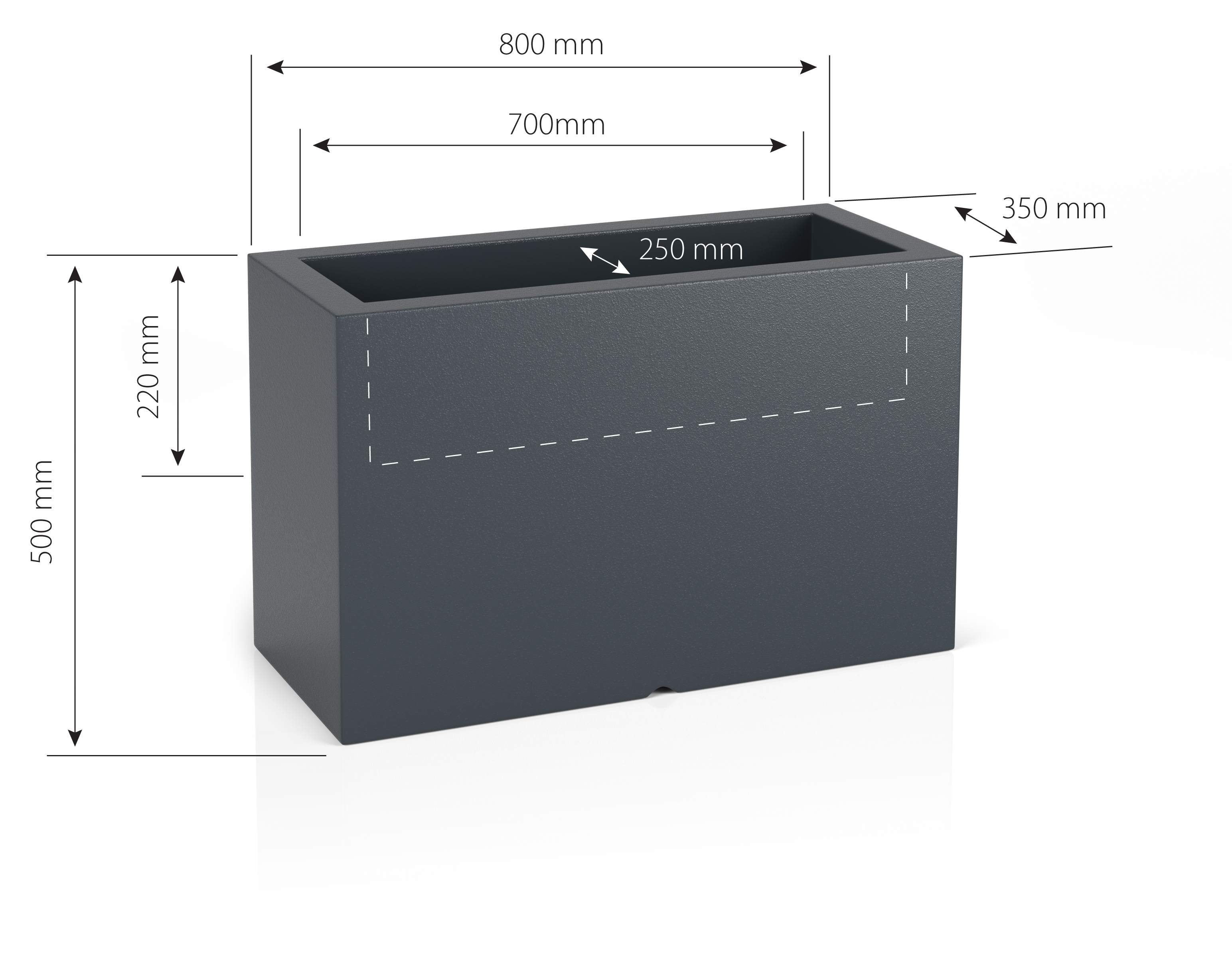 | Donica Lungo maxi | 50 cm | 80 cm x 35 cm | 10,5 | 22 cm | Polietylen PE | -40°C / +60°C / UV | do wnętrz i na zewnątrz |