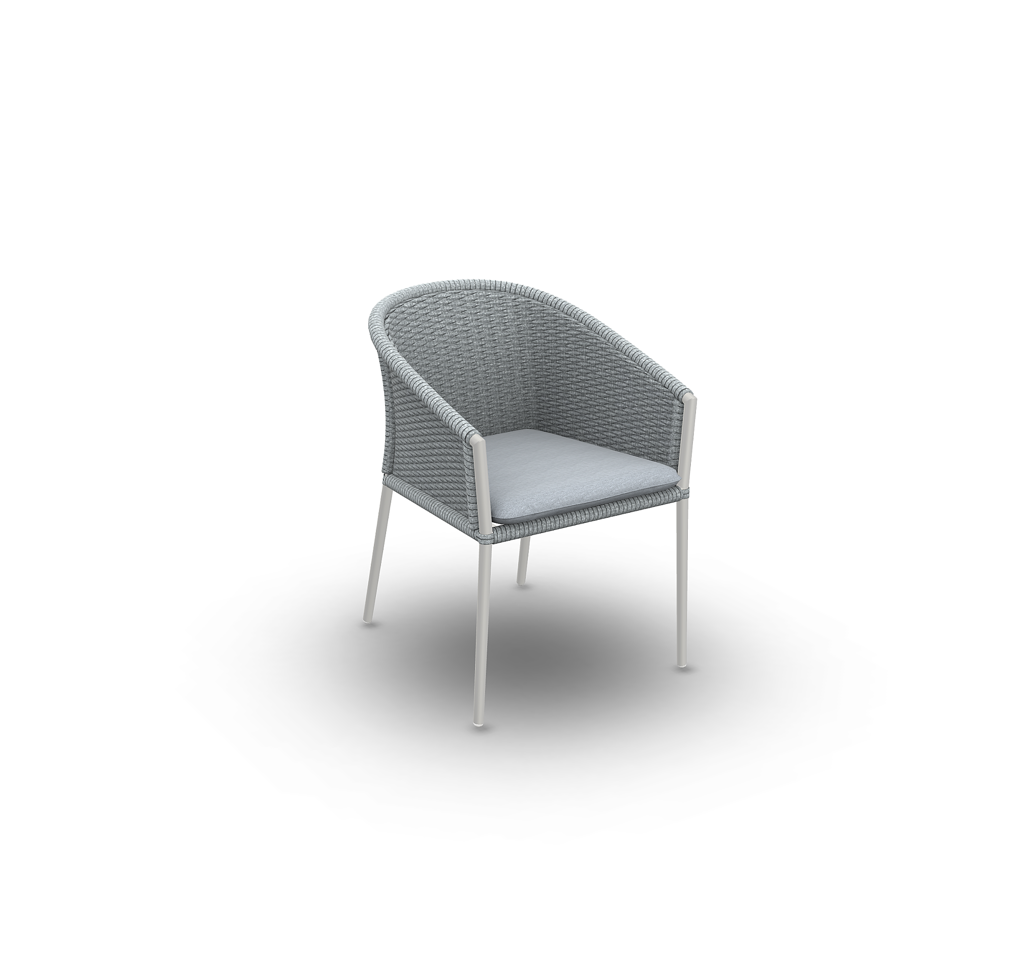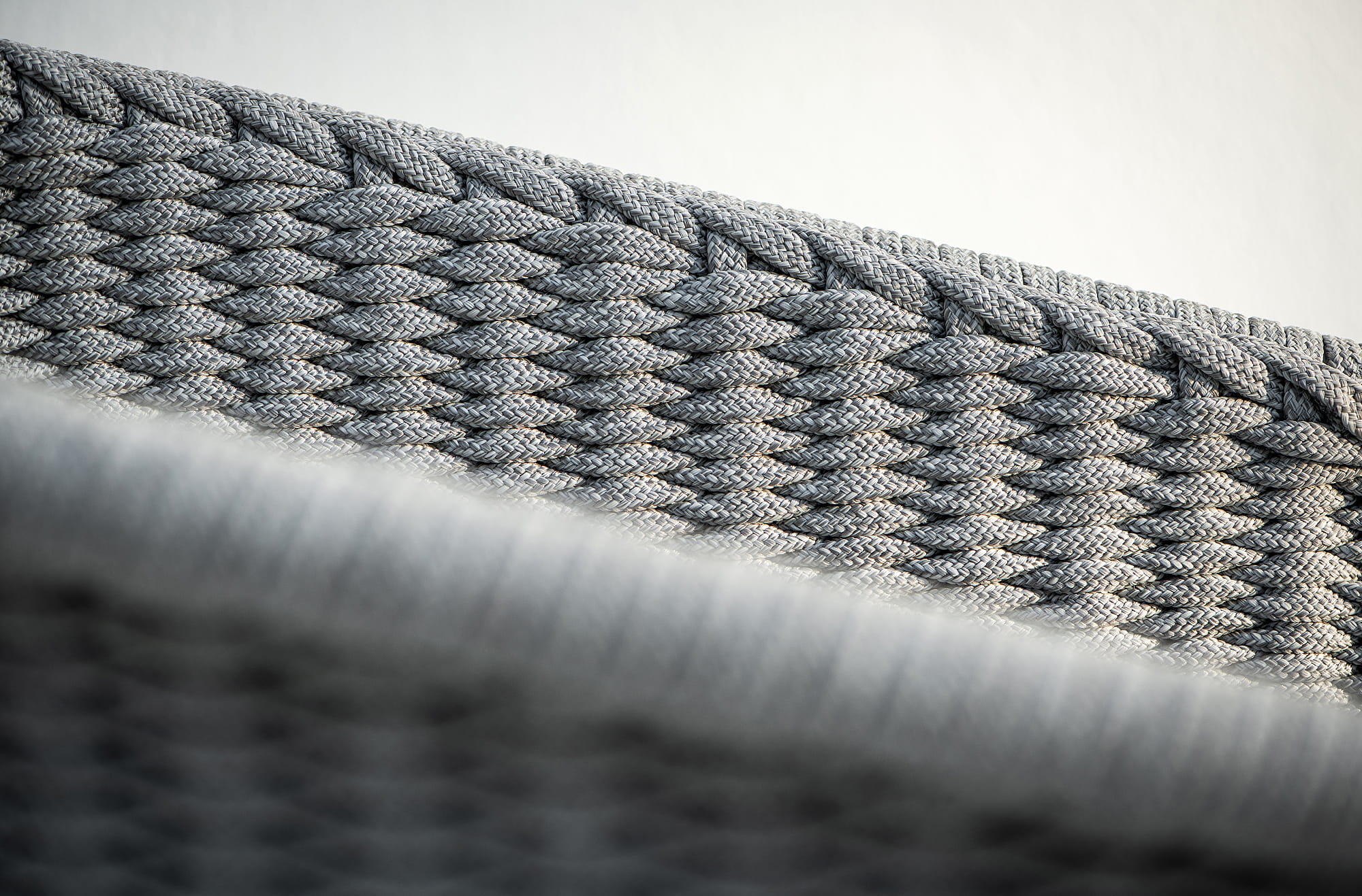 Zaokrąglone kształty i elegancki splot liny tworzą razem wyrafinowany wygląd, a poduszki Sunbrella na każdą pogodę nieprzerwanie utrzymują siedzenia w idealnym stanie.