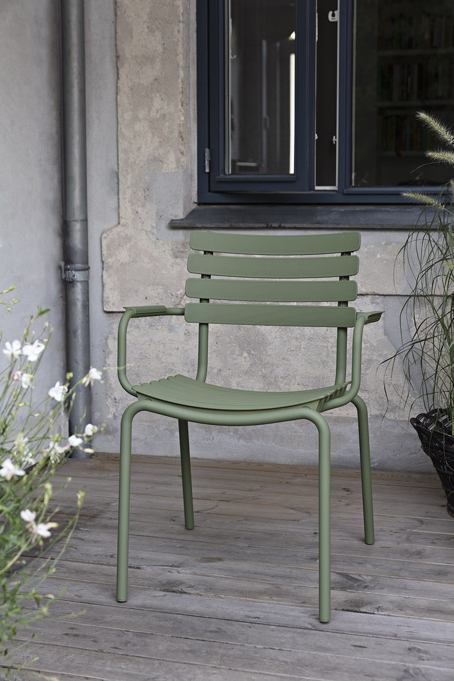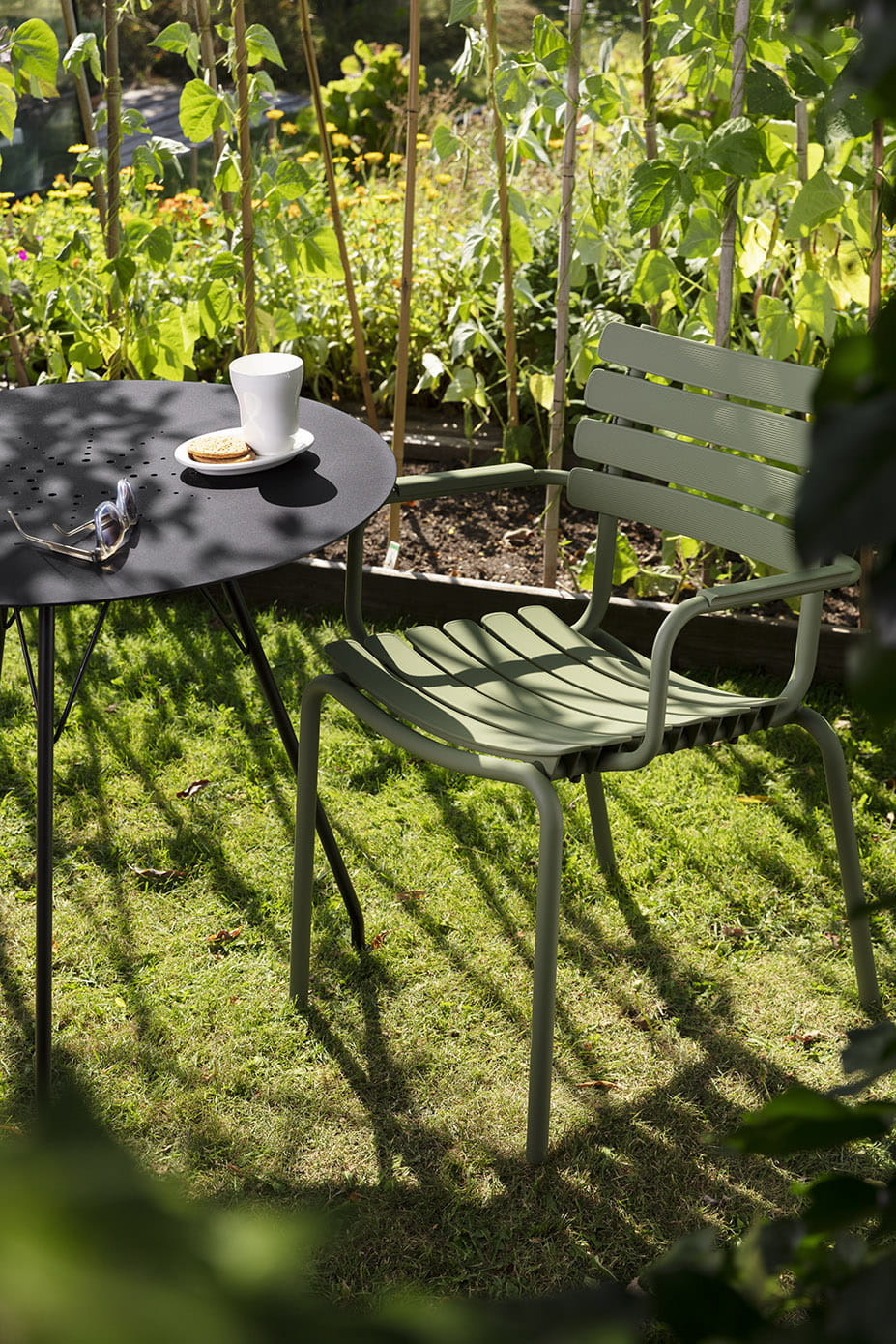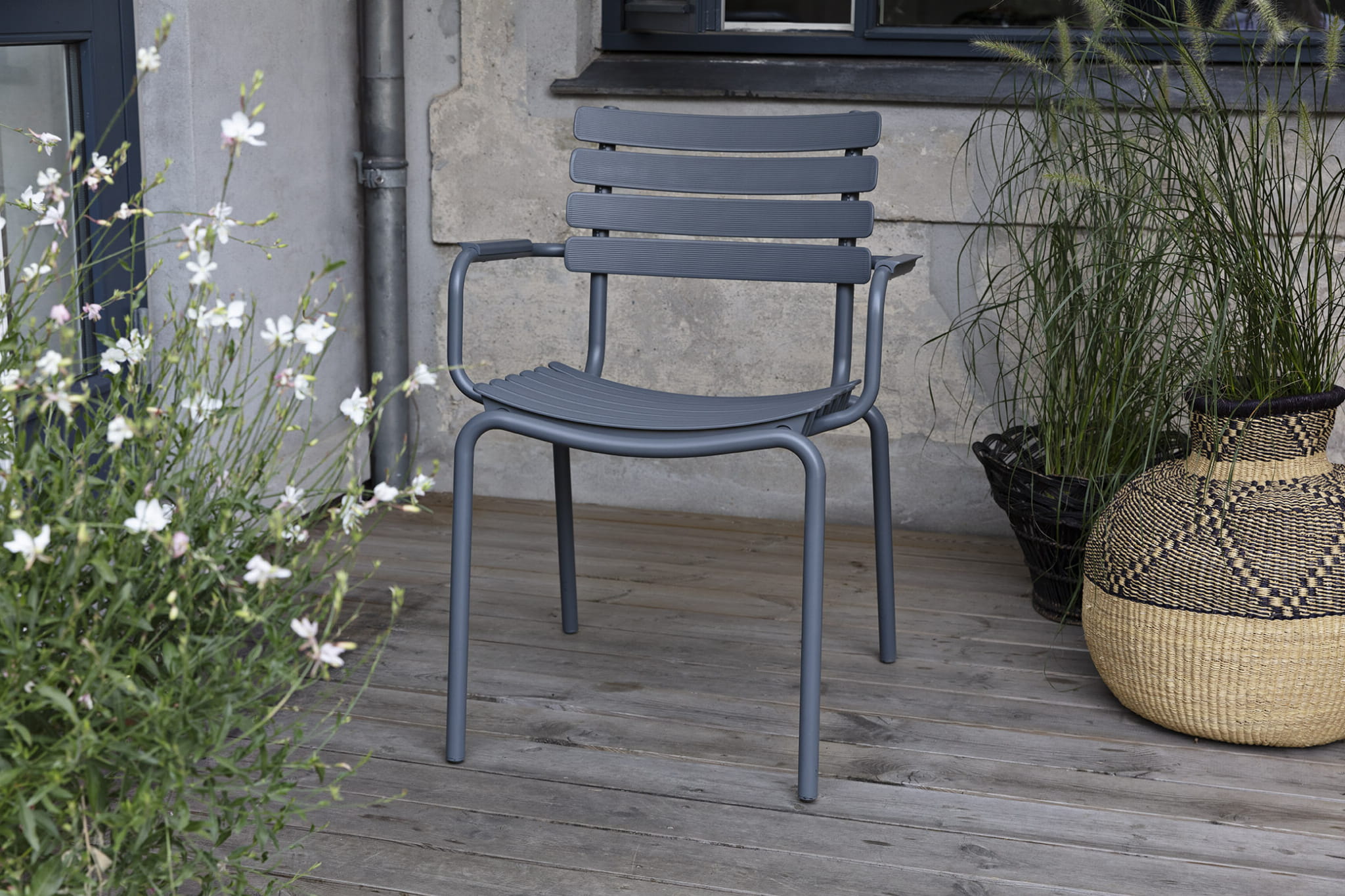 ReCLIPS to krzesło ogrodowe do jadalni z szerokimi plastikowymi lamelami zamocowanymi na lekkiej aluminiowej ramie malowanej proszkowo.