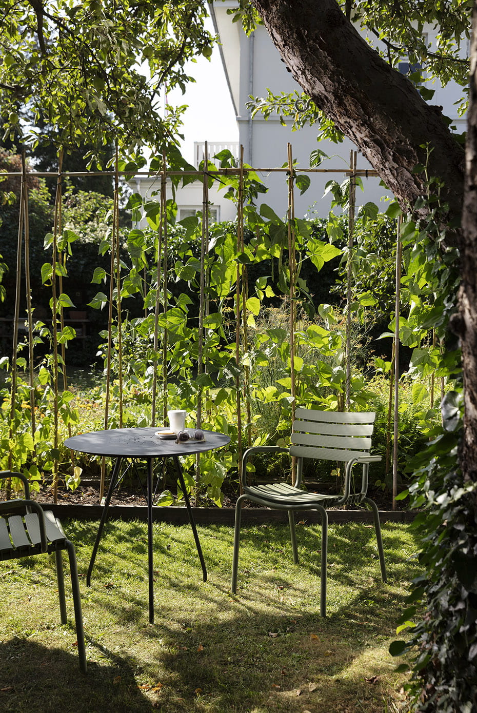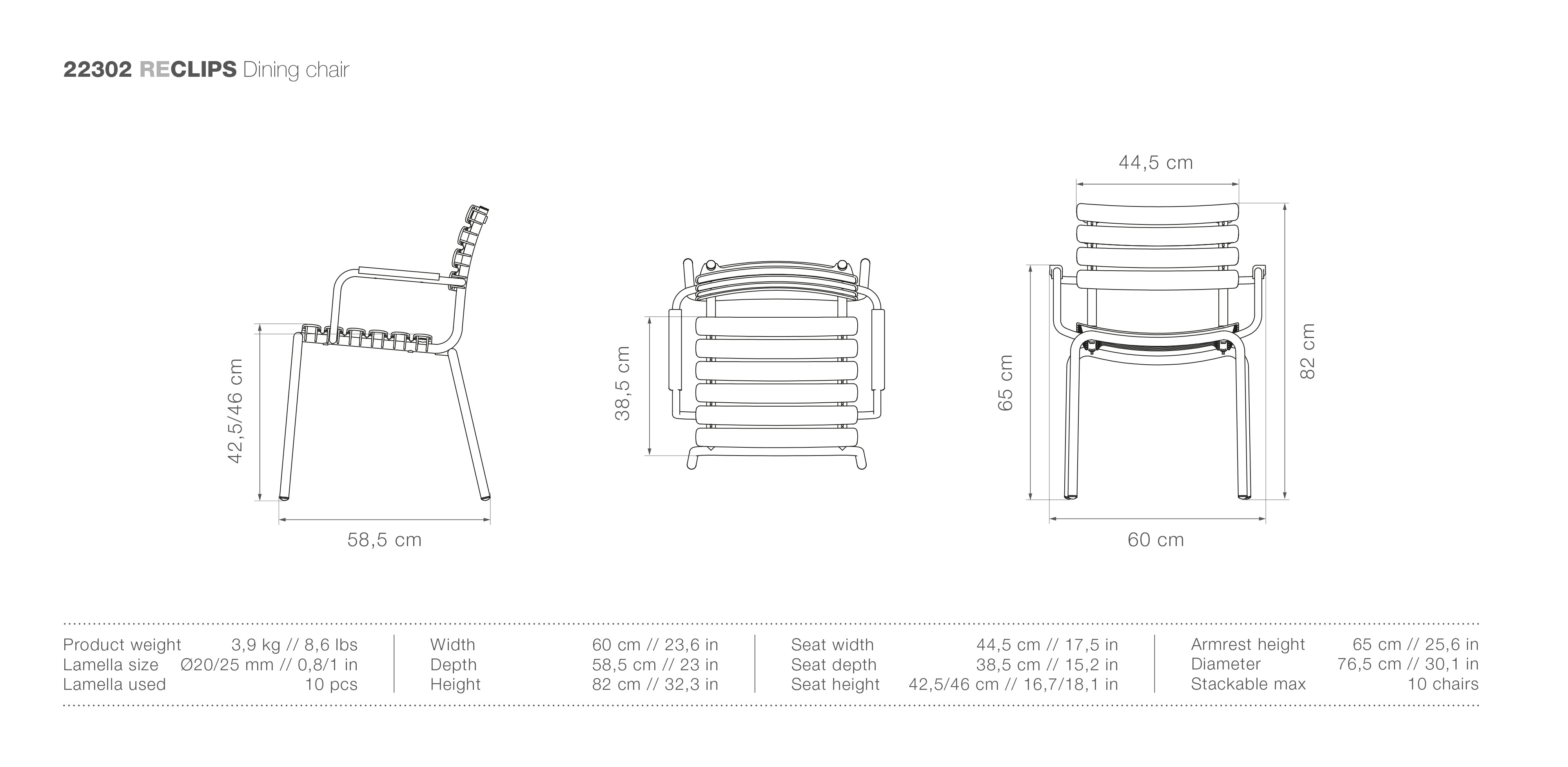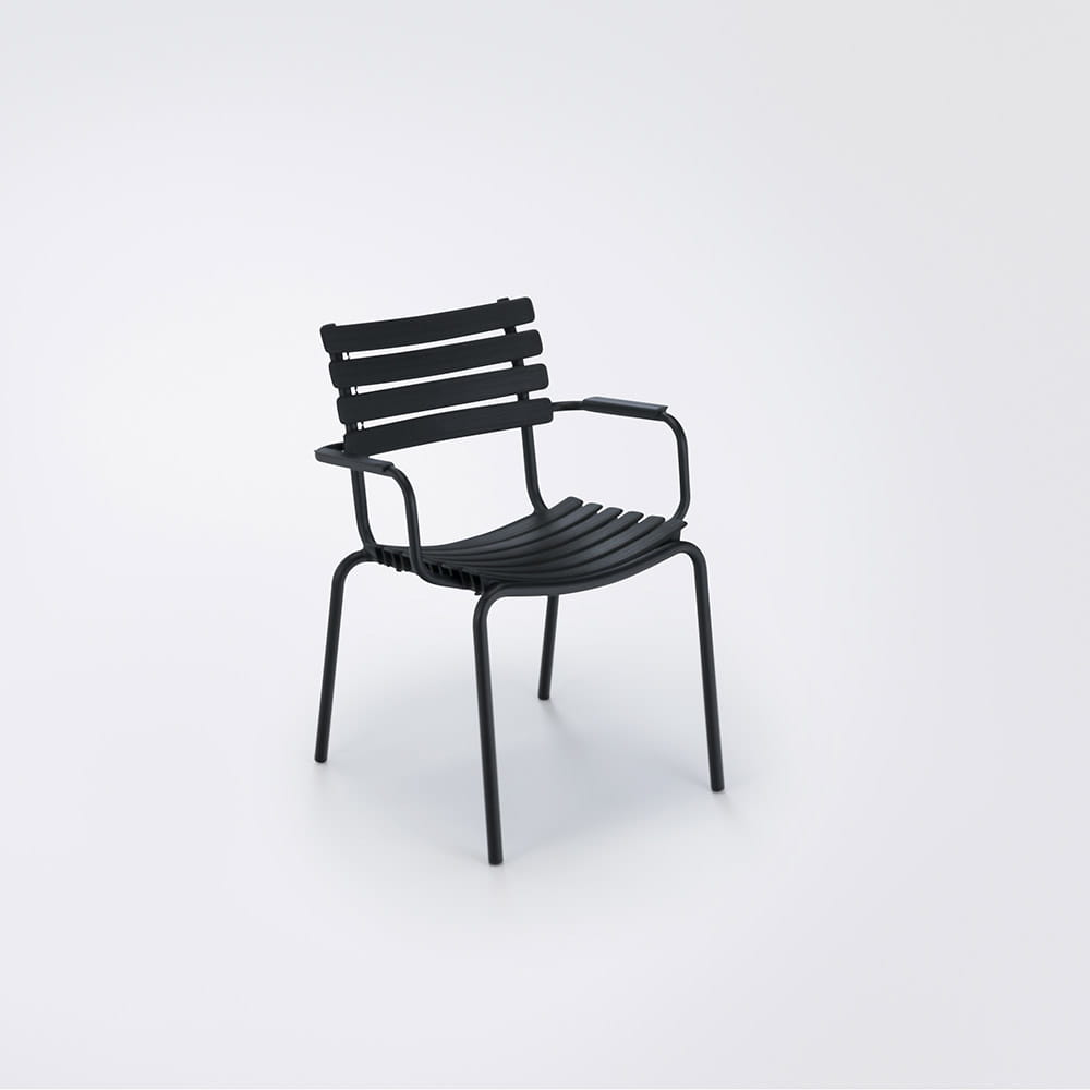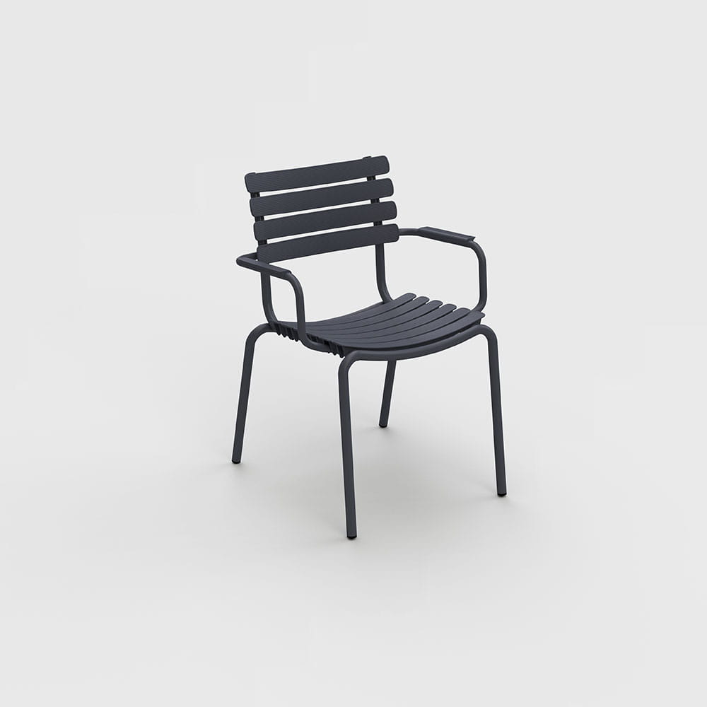 ReCLIPS to krzesło ogrodowe do jadalni z szerokimi plastikowymi lamelami zamocowanymi na lekkiej aluminiowej ramie malowanej proszkowo.