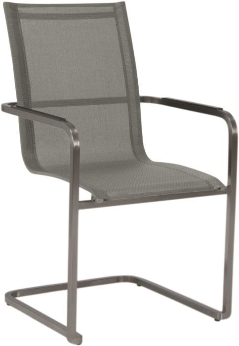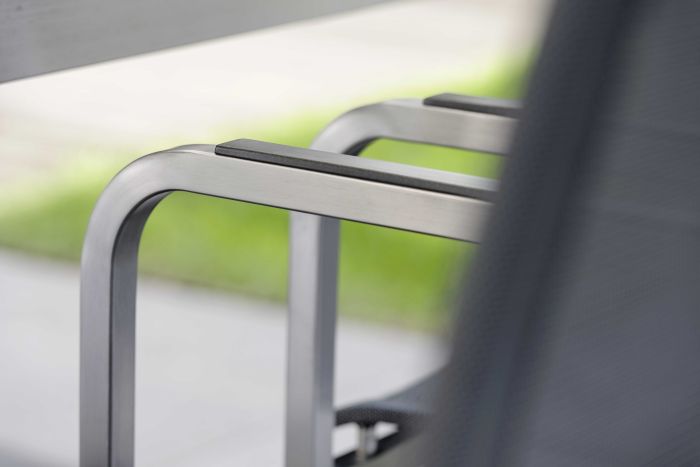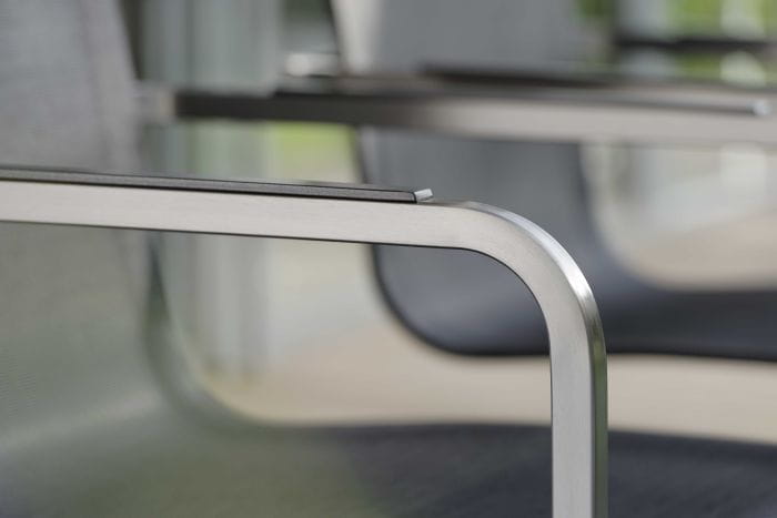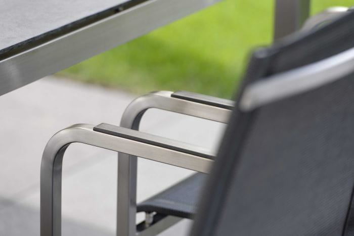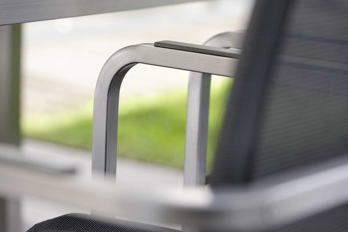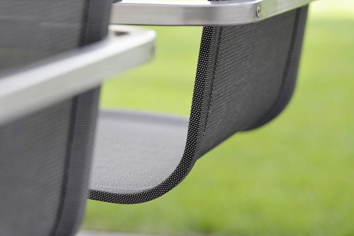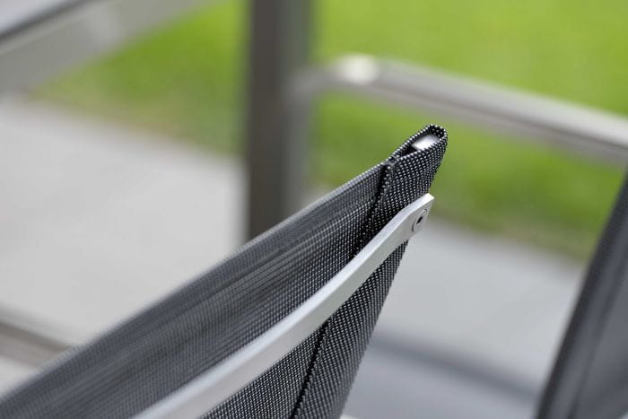 Krzesło ogrodowe Evoee na oparciu i siedzisku posiada materiał w formie miękkiej i elastycznej siateczki.