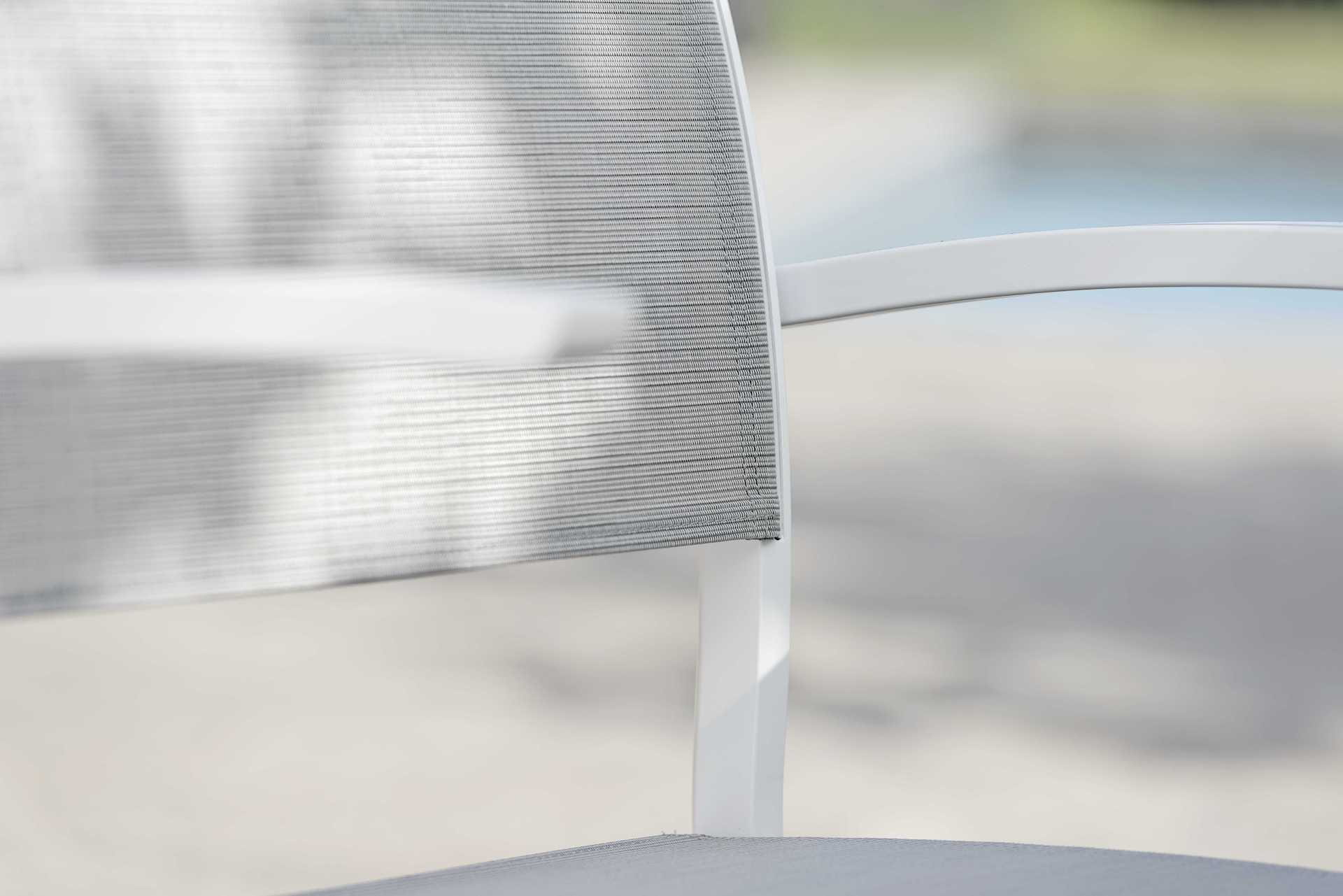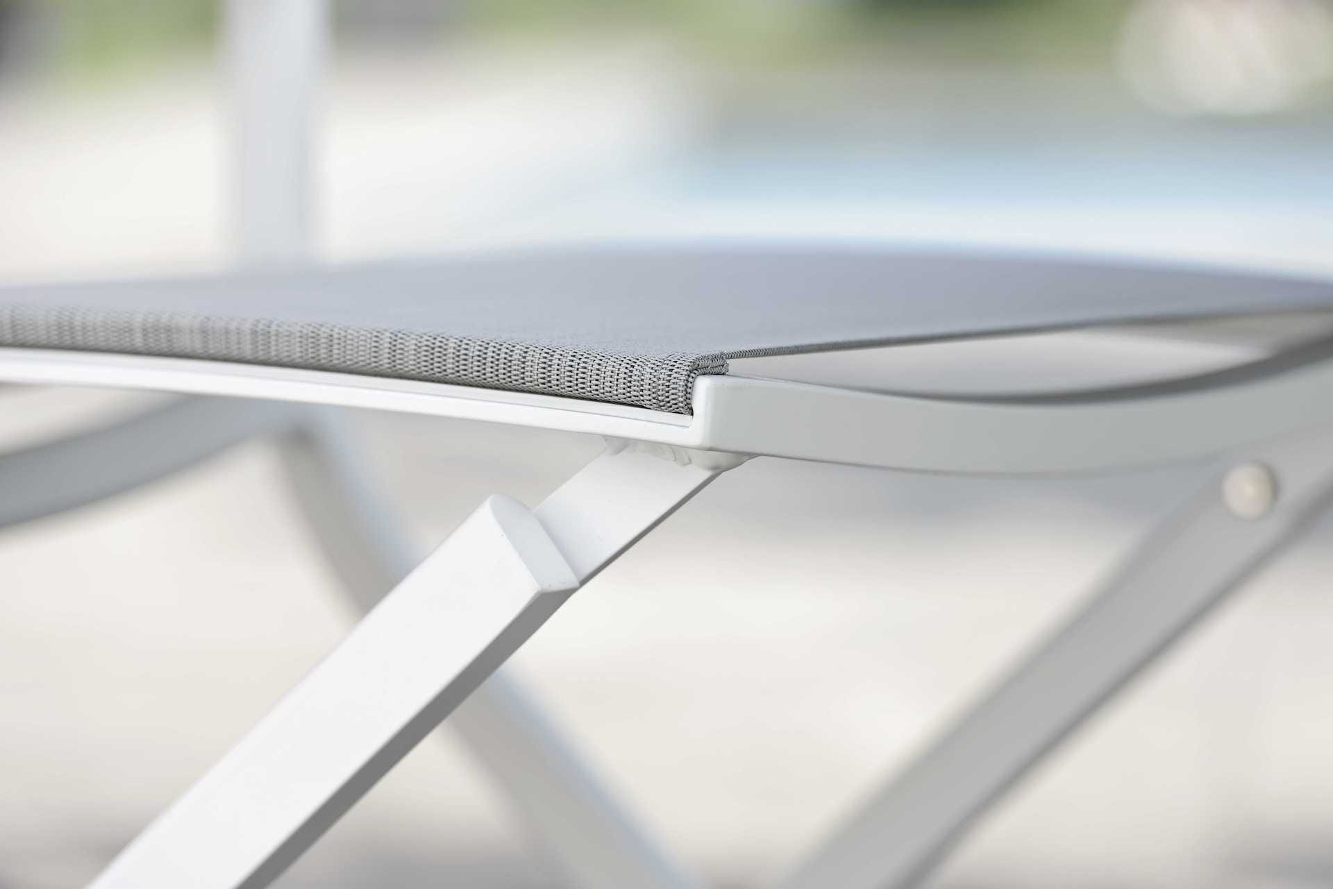 Wykonane z aluminium, z oparciem i siedziskiem z tkaniny tekstylnej.