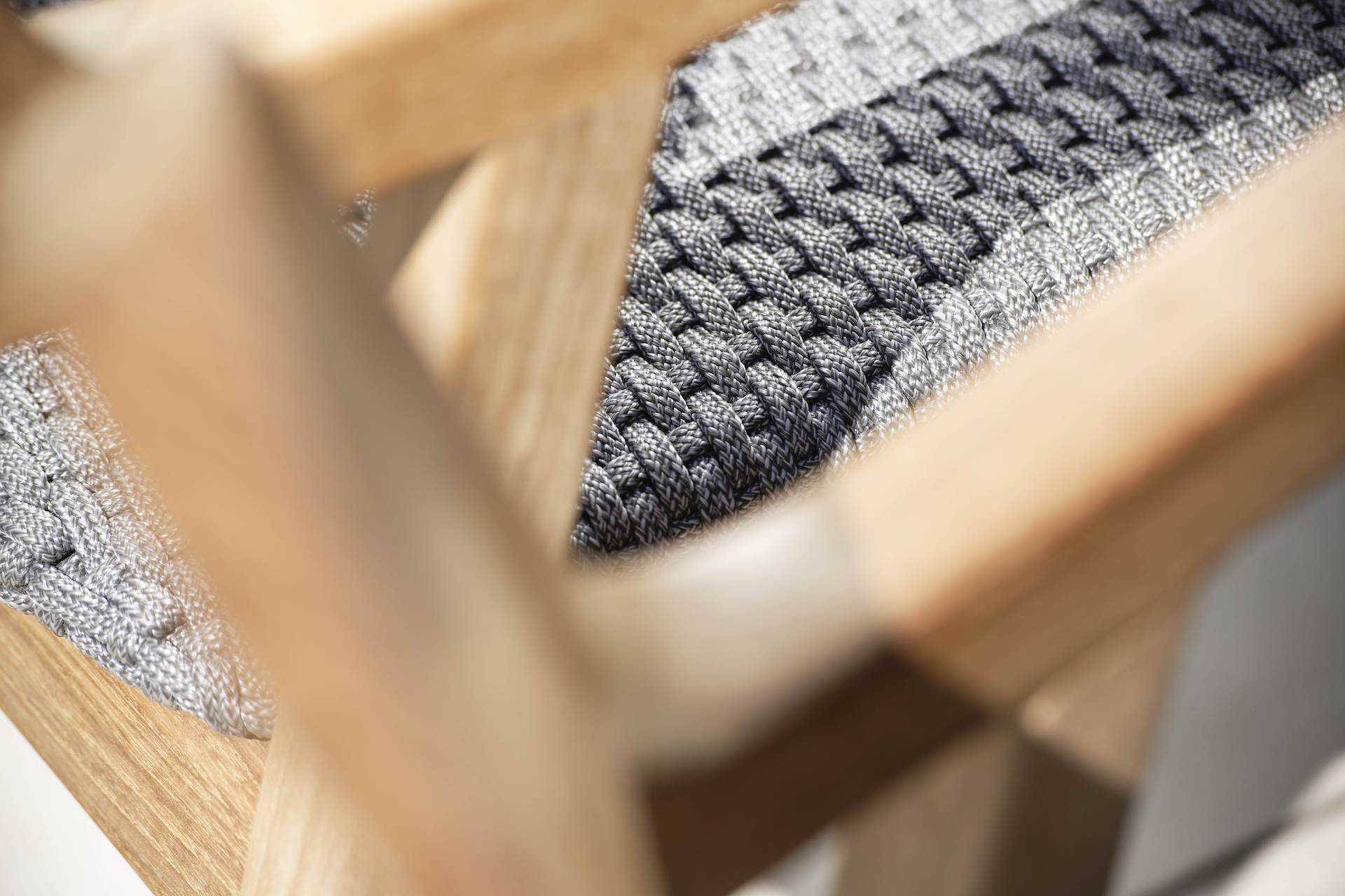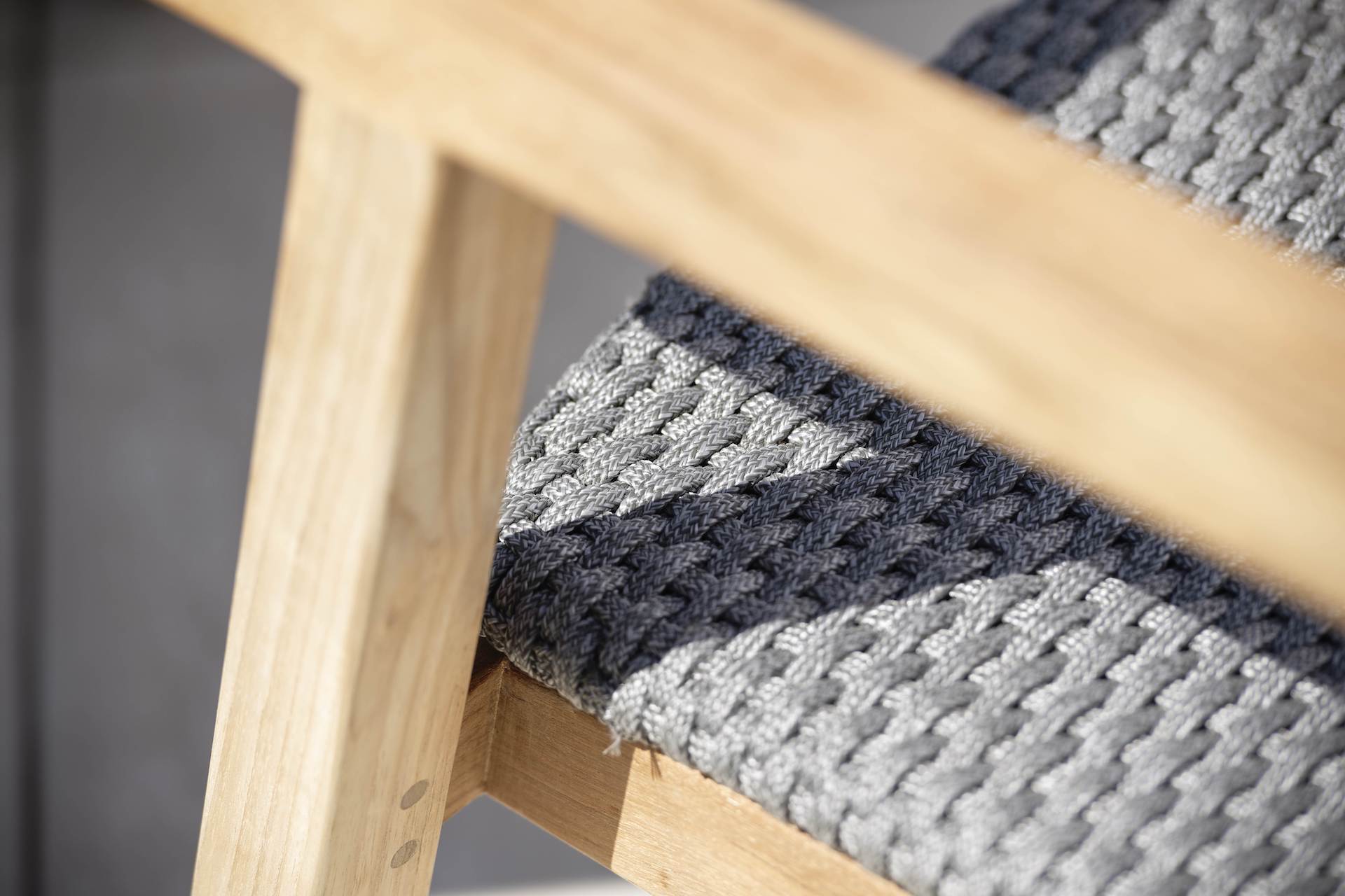 Krzesło ogrodowe TAJA posiada stabilną, drewnianą ramę i plecione siedzisko z syntetycznego sznurka w kolorze szarym.