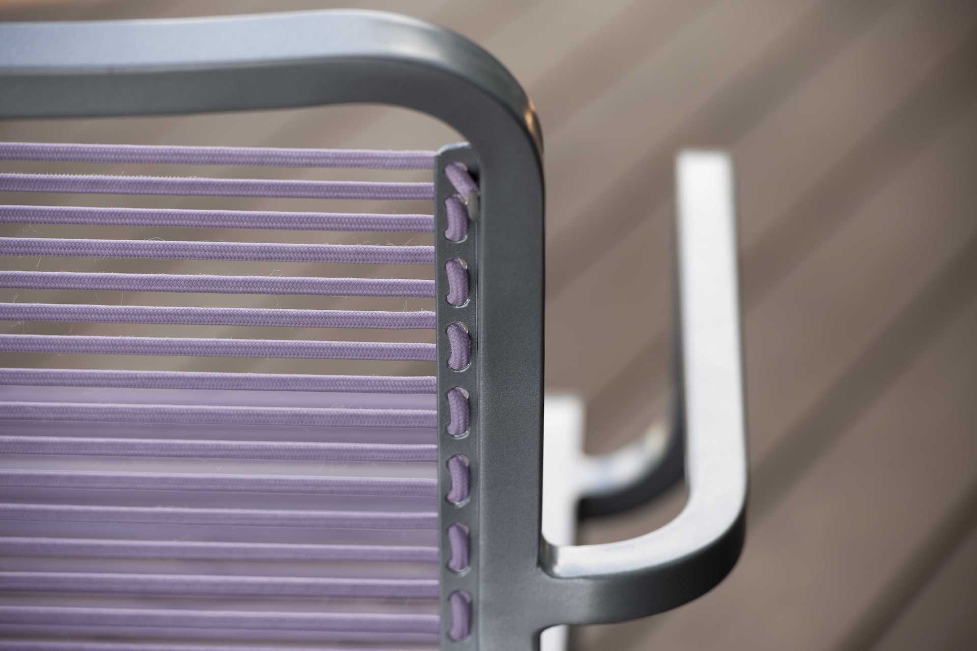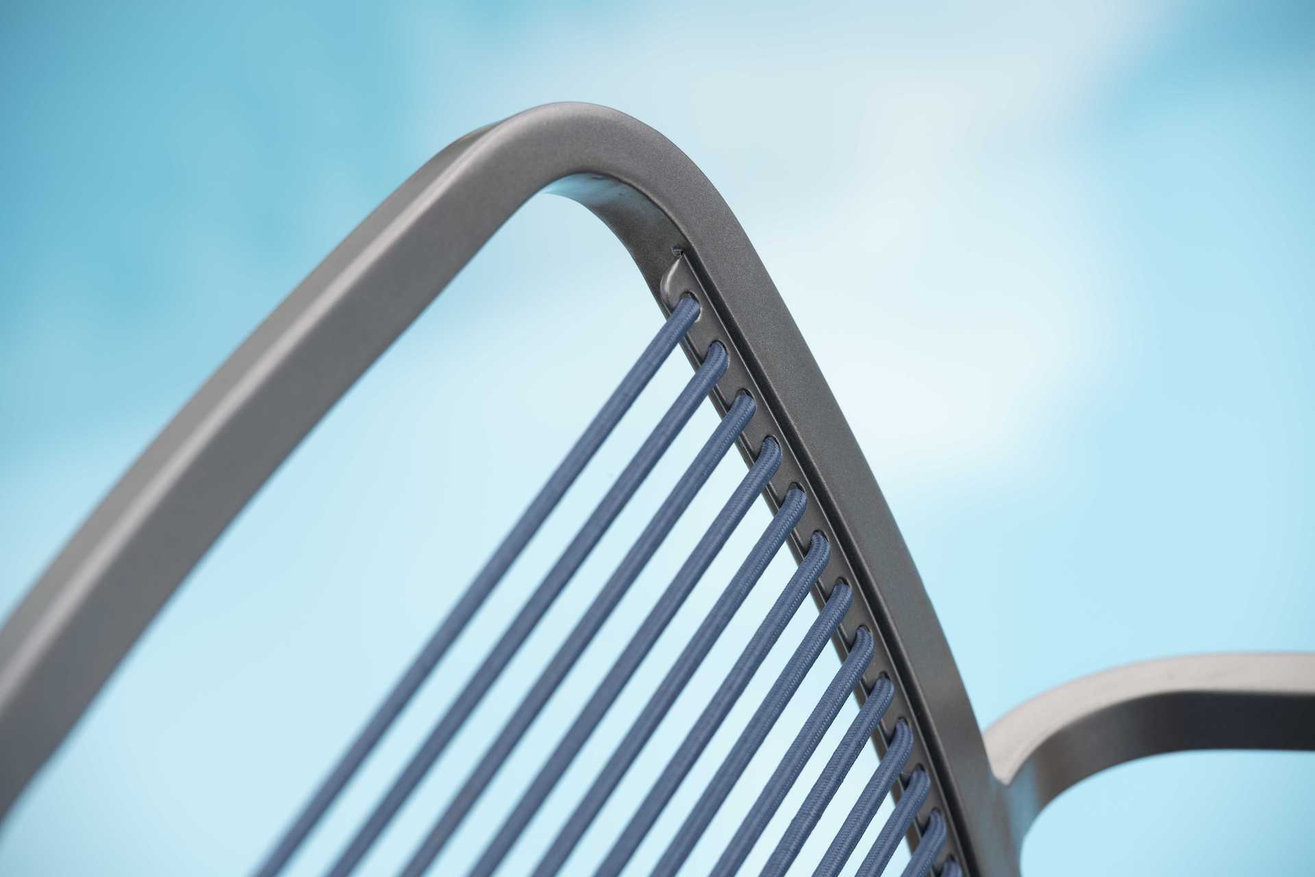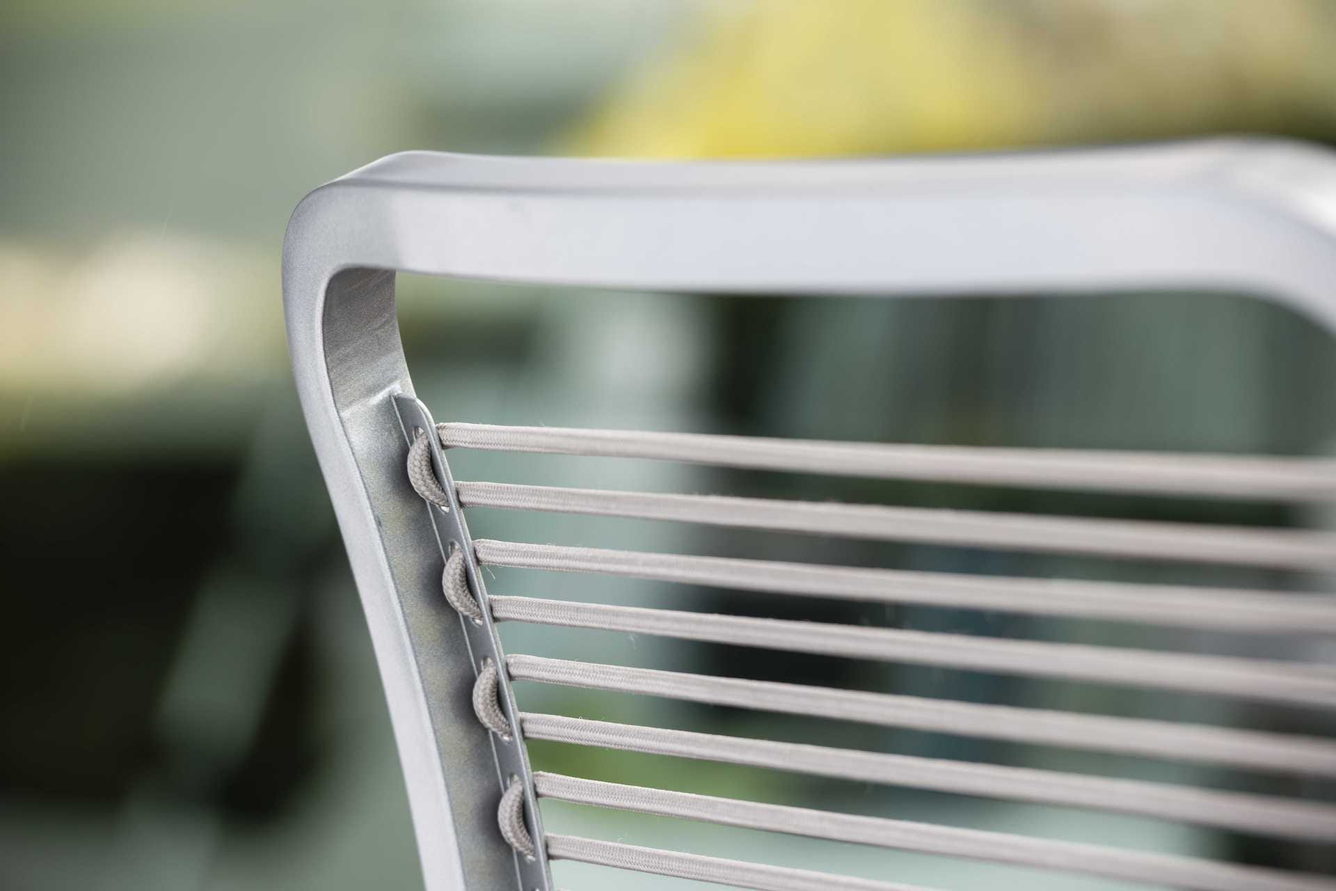 Krzesło ogrodowe Oskar na oparciu i siedzisku posiada miękkie, elastyczne a jednocześnie wytrzymałe i dedykowane do używania na zewnątrz paski podkreślające jego charakter.