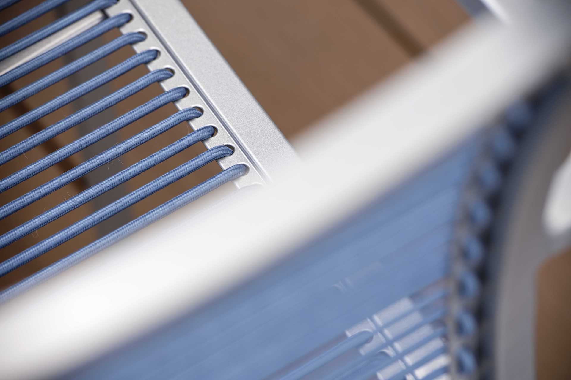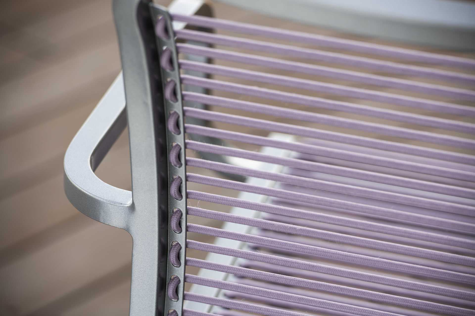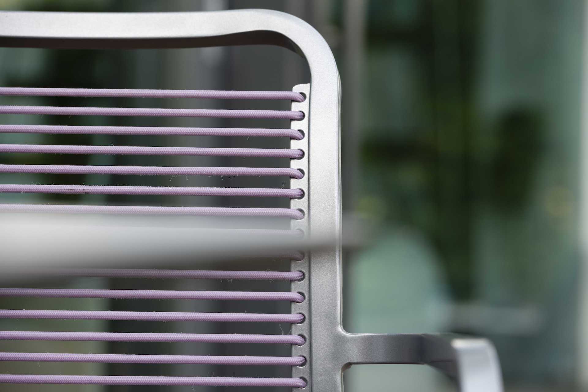 Krzesło ogrodowe Oskar na oparciu i siedzisku posiada miękkie, elastyczne a jednocześnie wytrzymałe i dedykowane do używania na zewnątrz paski podkreślające jego charakter.