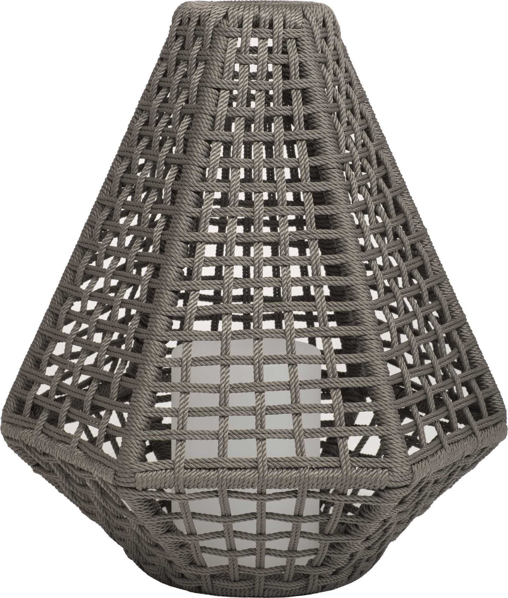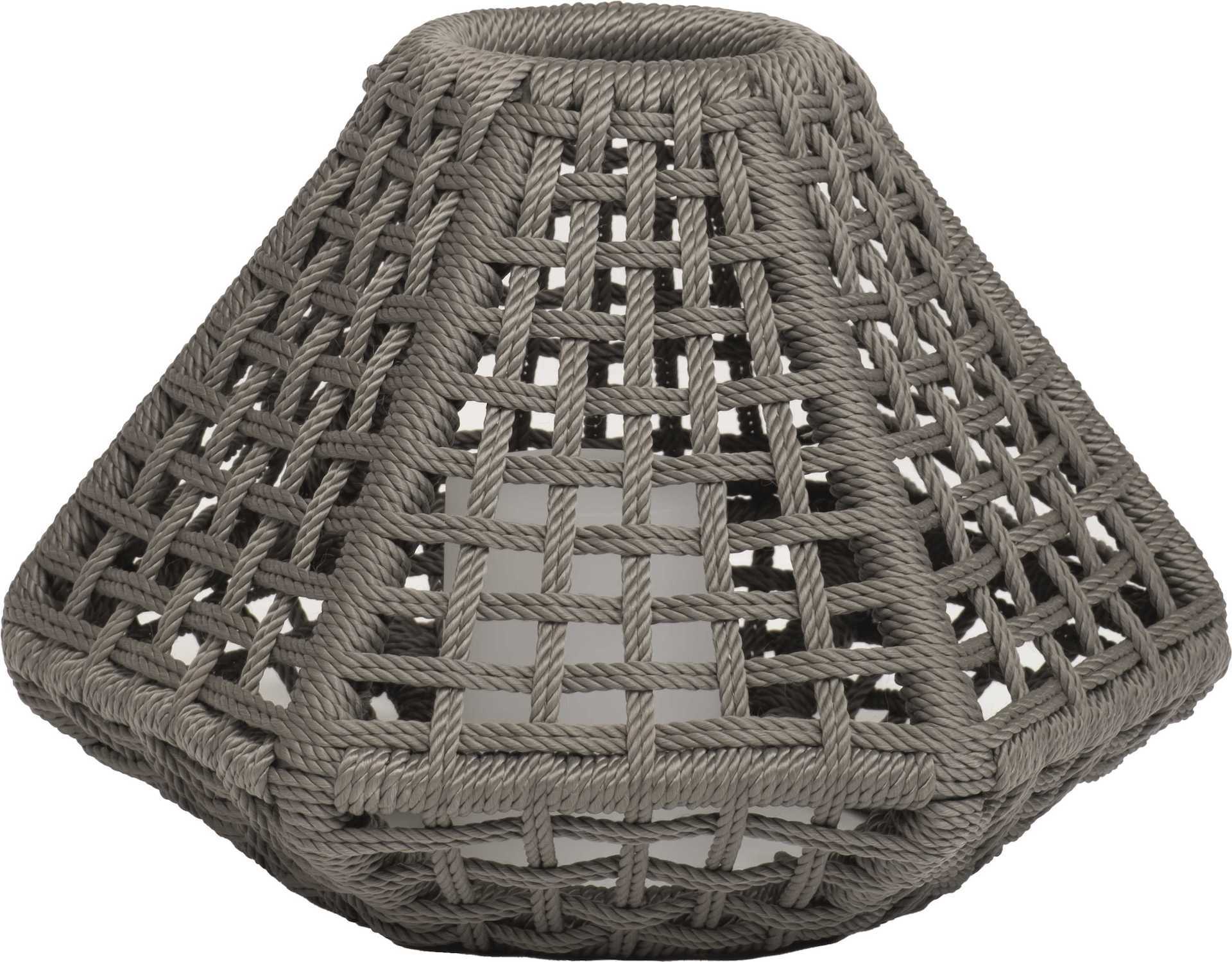 Lampa w ażurowym wykończeniu z plecionego sznurka w kolorze platynowym, zapewnia piękną grę światła i cienia.