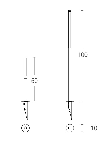 Wersja outdoor to słupek oświetleniowy występujący w 2 wysokościach: 50 i 100 cm, który można zamocować do betonowej podstawy (baza) lub wbić bezpośrednio do gruntu używając do tego celu specjalnego ostrza.
