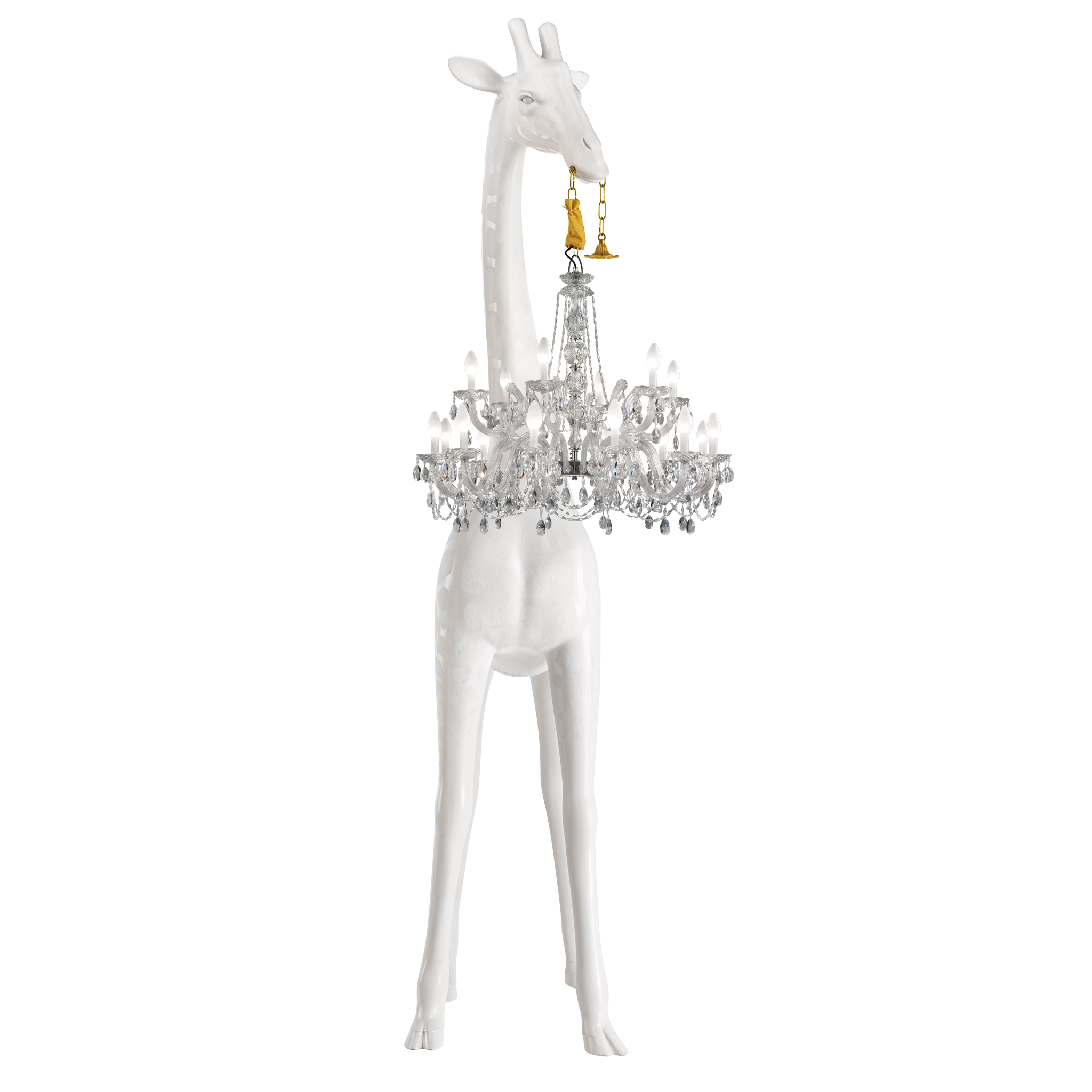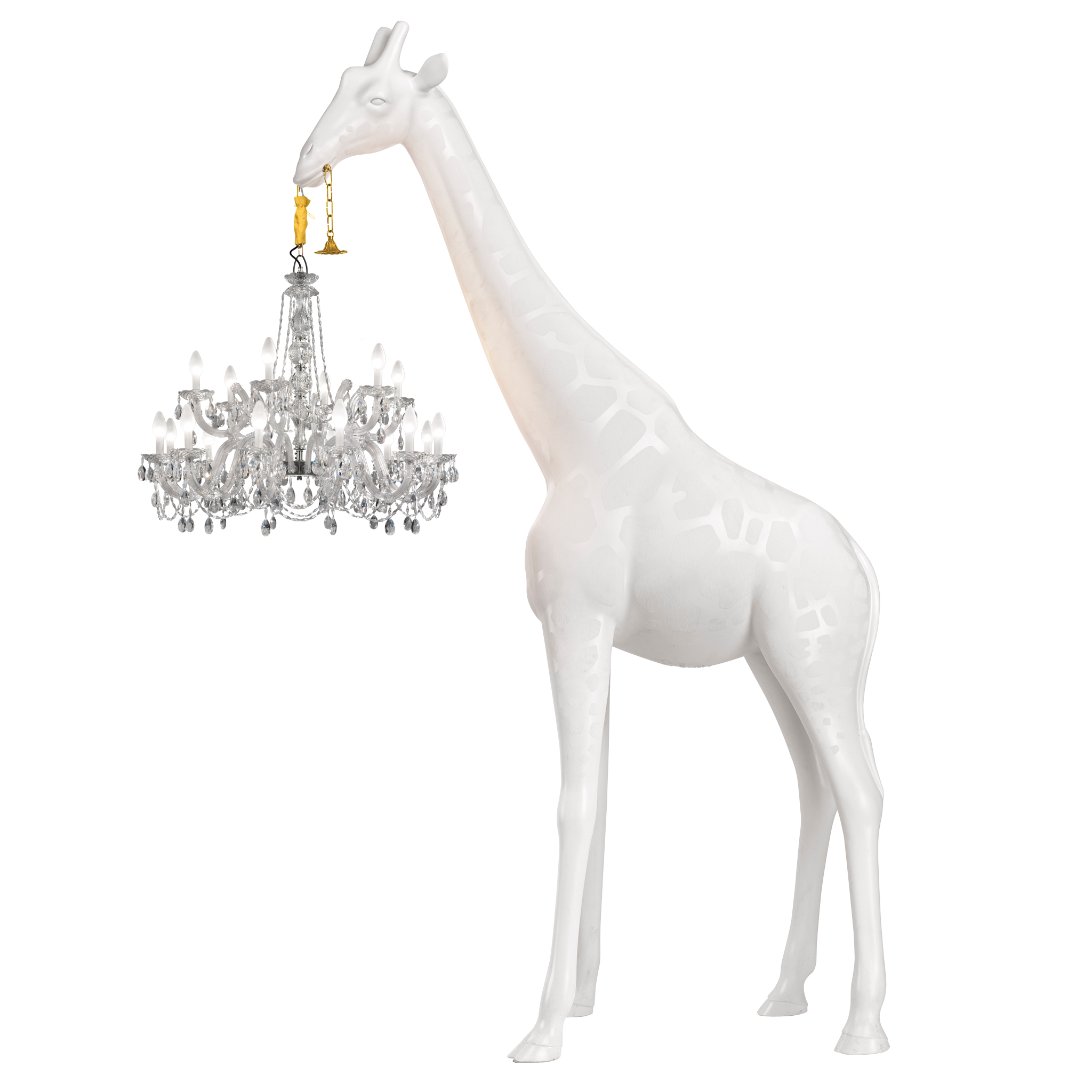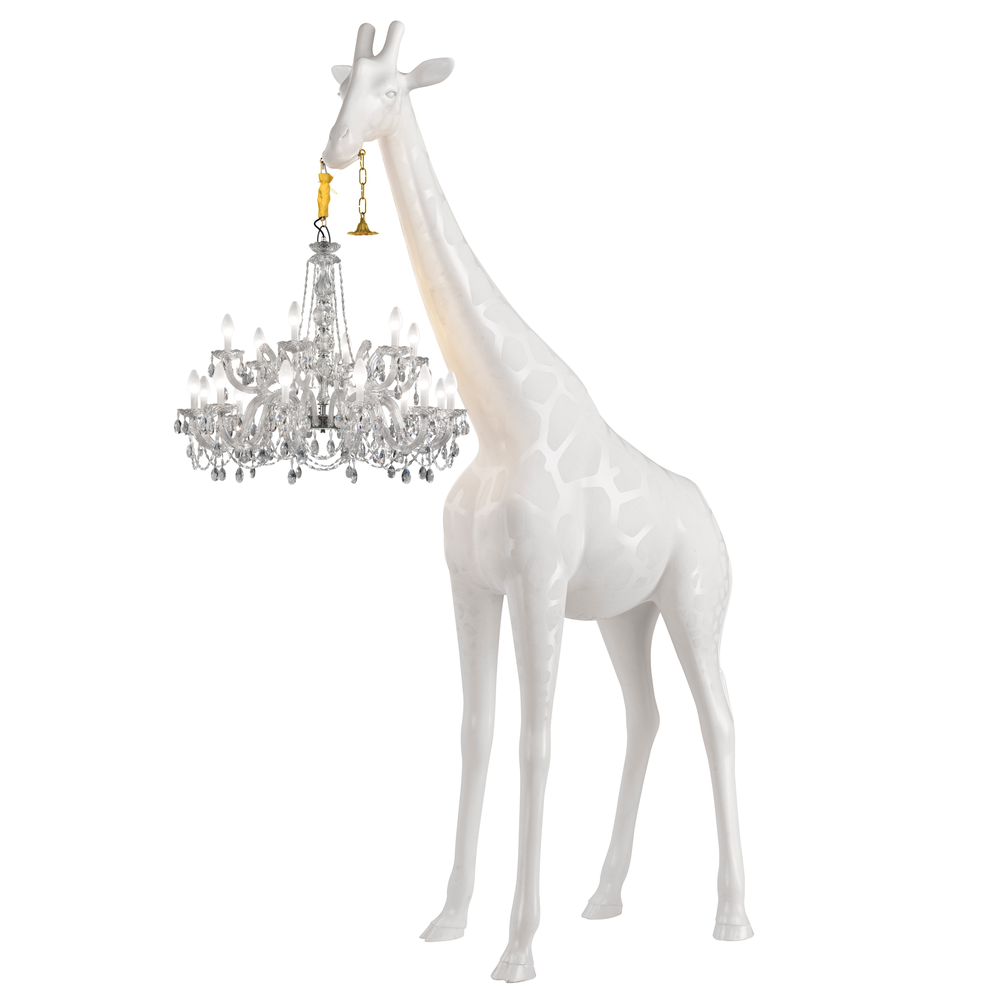 Marzycielska żyrafa trzymająca klasyczny żyrandol w stylu Marie-Thérèse.