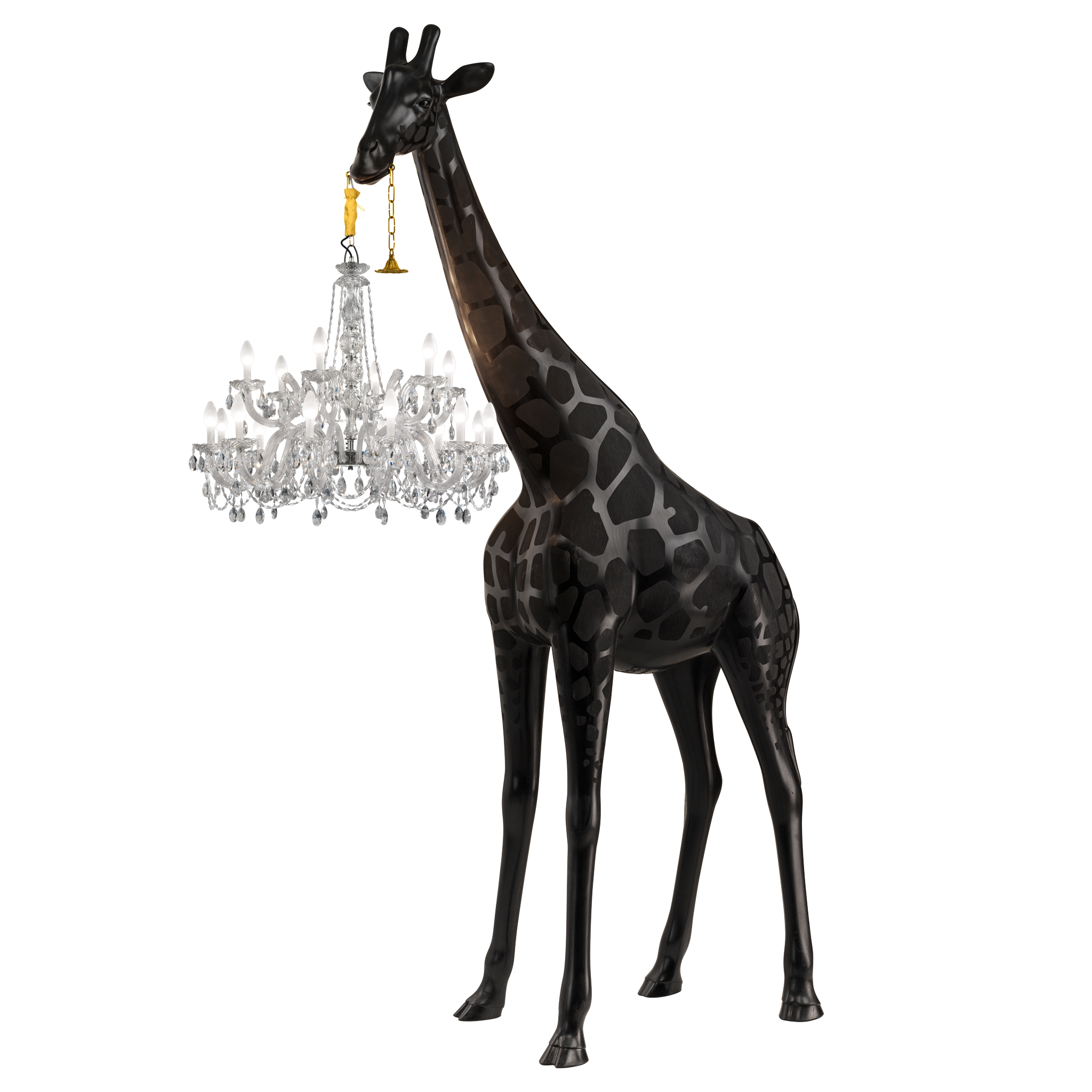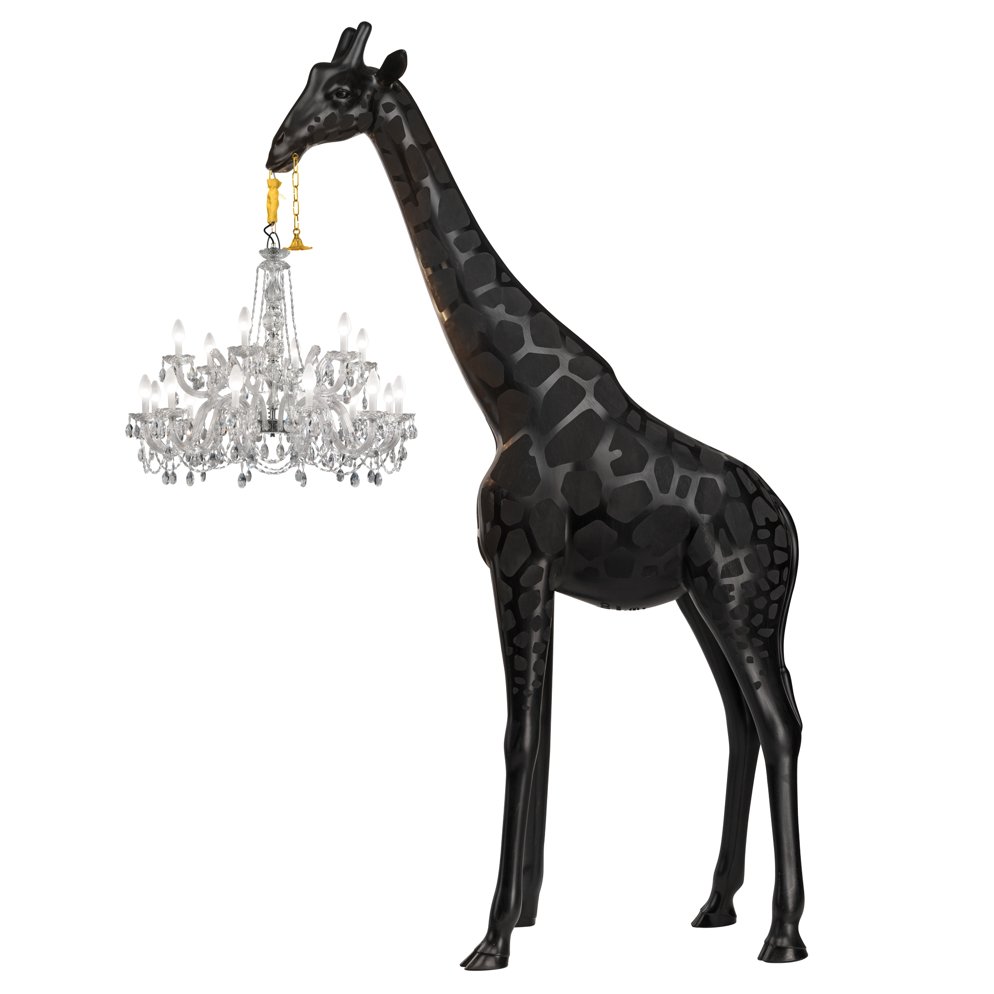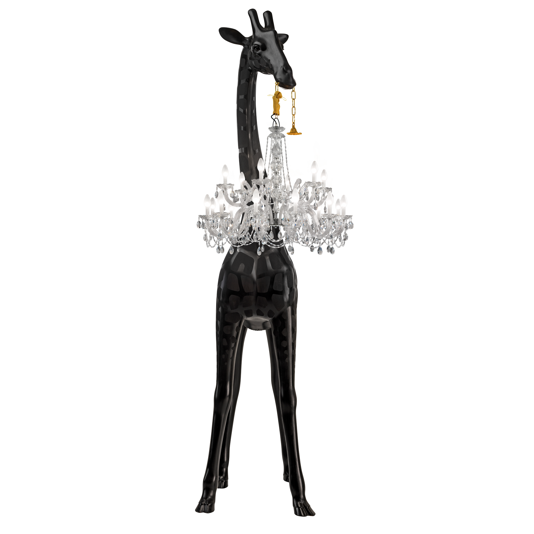 Marzycielska żyrafa trzymająca klasyczny żyrandol w stylu Marie-Thérèse.