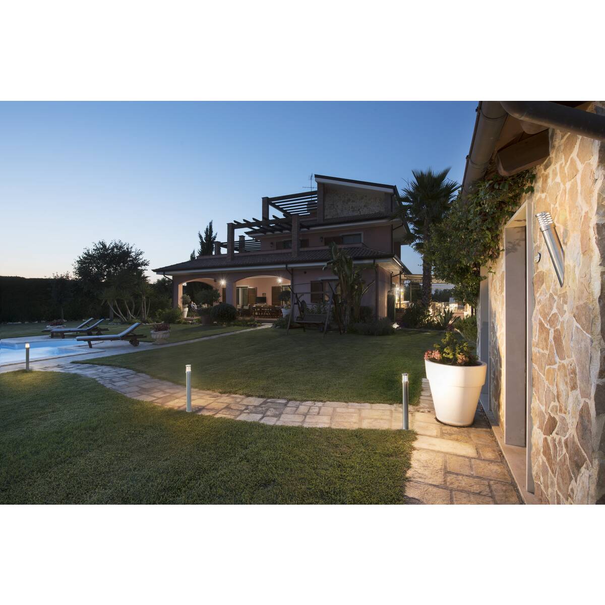 Oświetlenie zewnętrzne SLV tworzy wspaniałą atmosferę i olśniewający efekt w domu i ogrodzie, zarówno w mroźną noc zimową, jak i w ciepły letni wieczór.