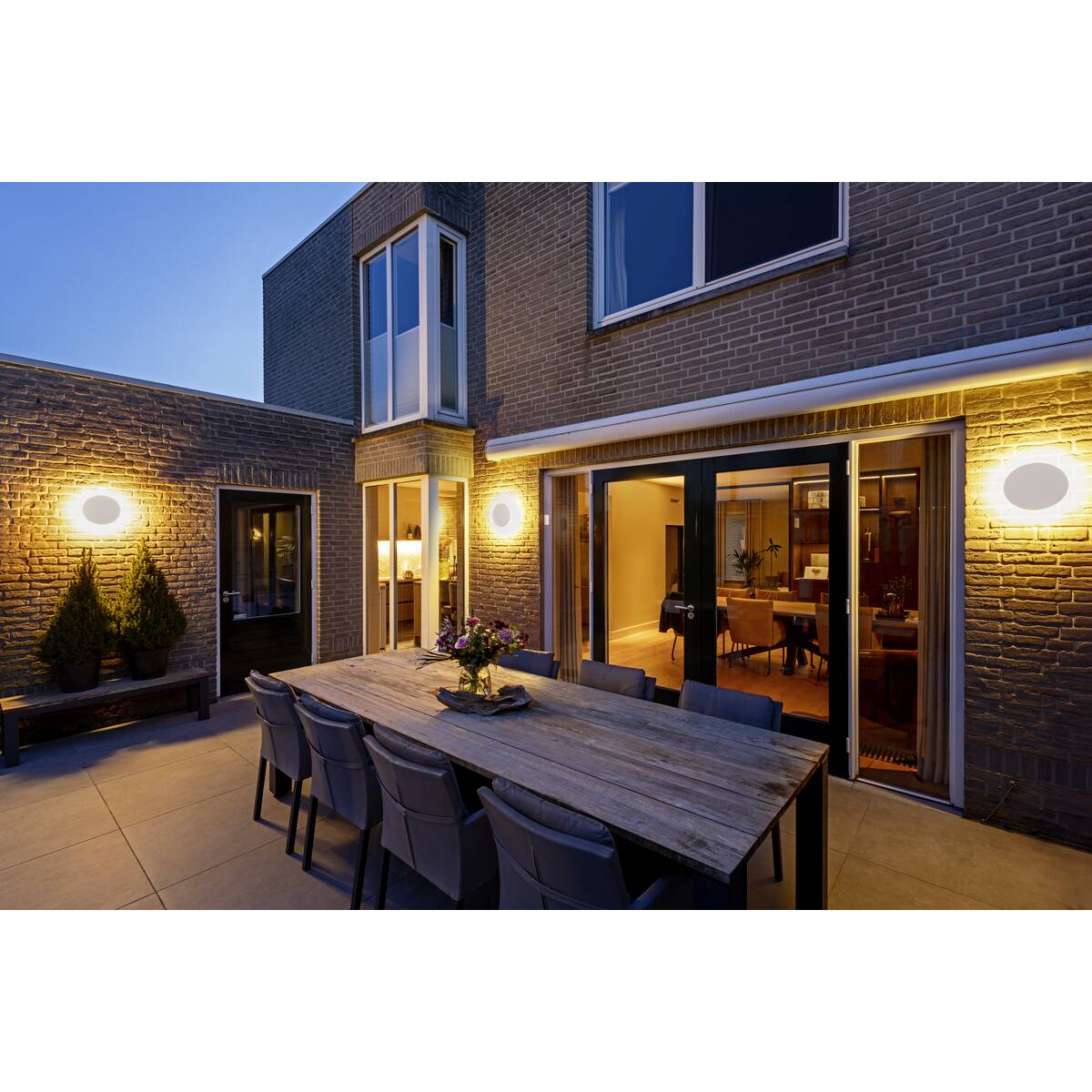 Możliwość przyciemniania, pośrednie, ciepłe białe światło (2700 K / 3000 K), które można regulować za pomocą przełącznika CCT, dyskretnie i bez odblasków podkreśla fasady