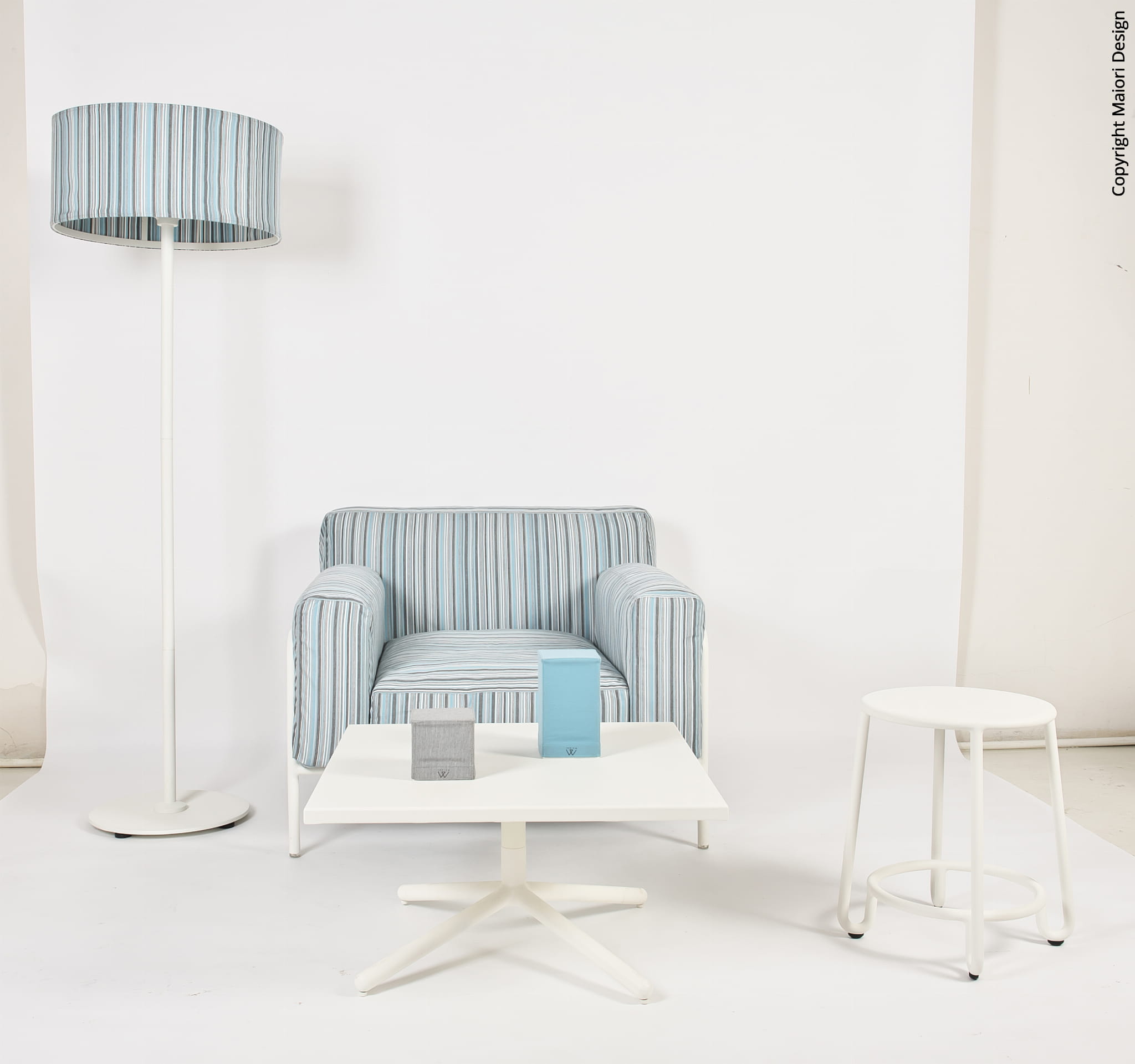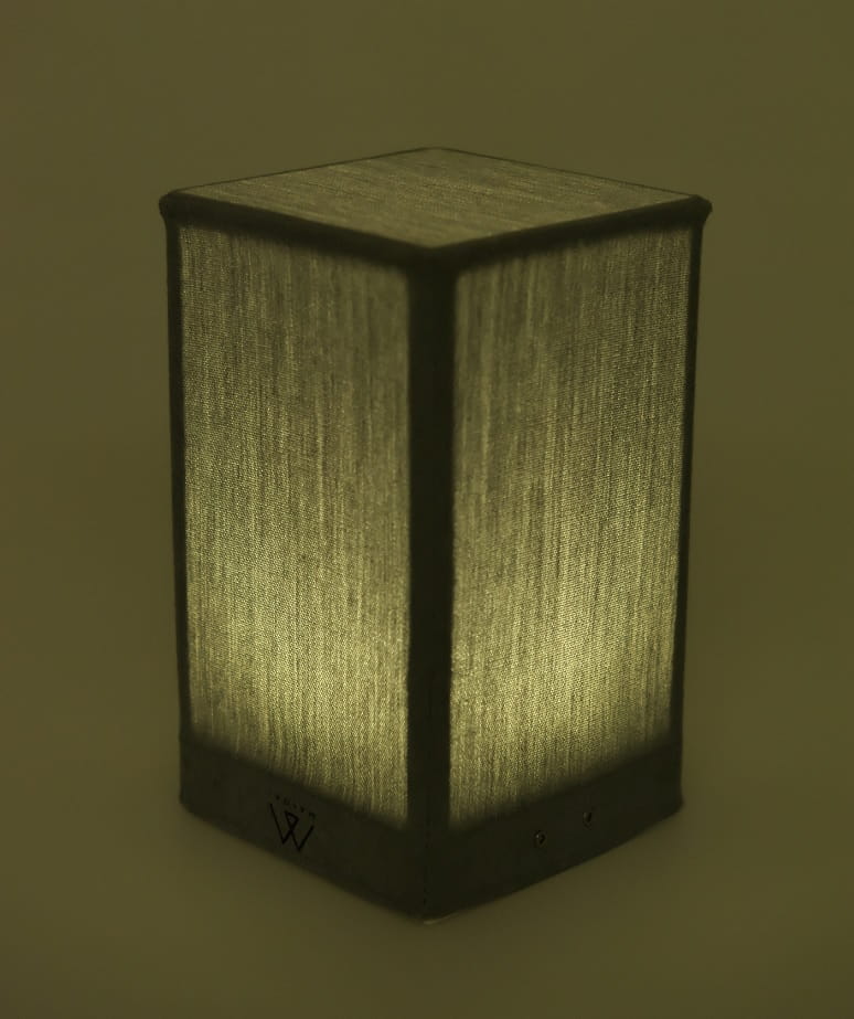 Klosz wykonany z wytrzymałej tkaniny Sunbrella, dzięki czemu lampa delikatnie rozprasza światło.