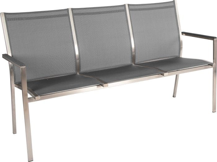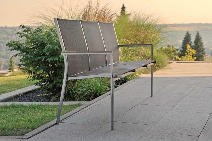 ławka ogrodowa CARDIFF na oparciu i siedzisku posiada materiał w formie miękkiej i elastycznej siateczki.
