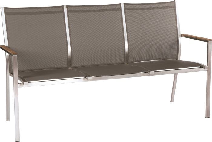 - stelaż ze stali nierdzewnej z materiałem w kolorze toupe i drewnianymi podłokietnikami teak.