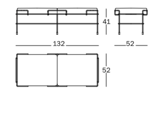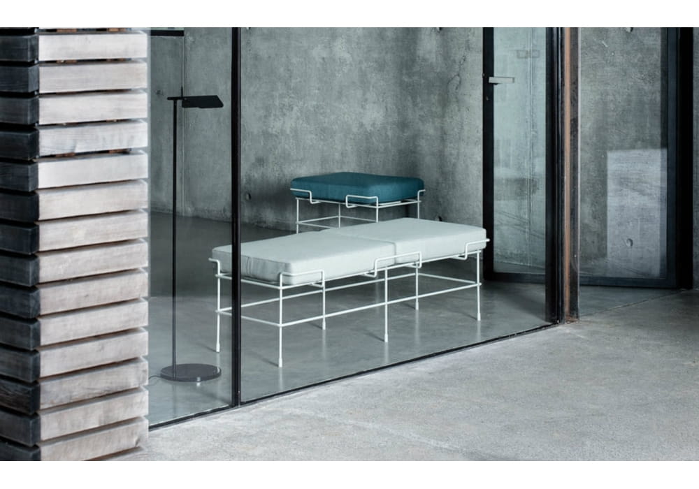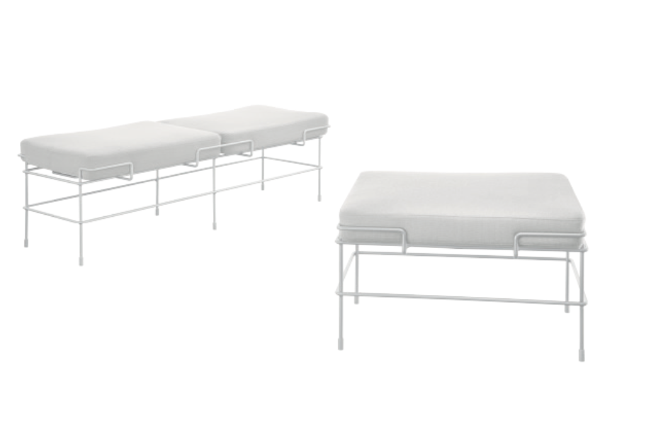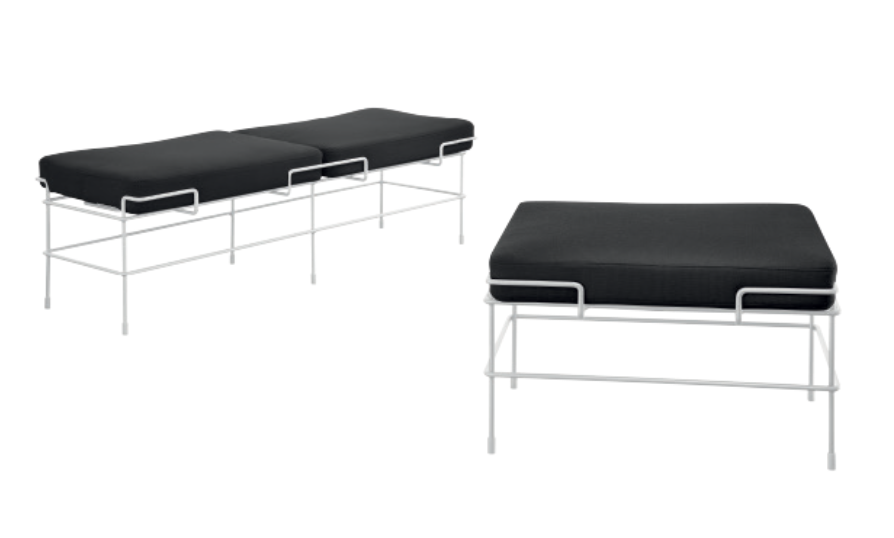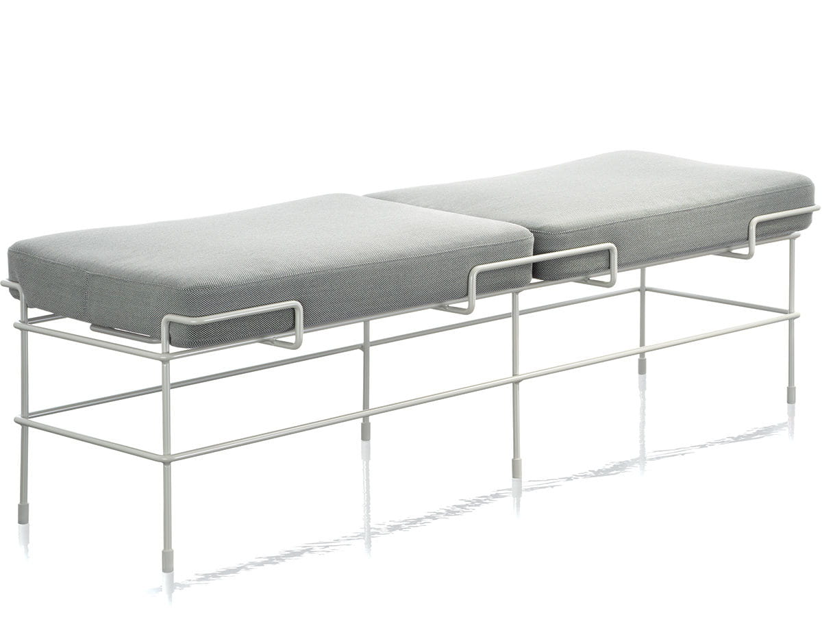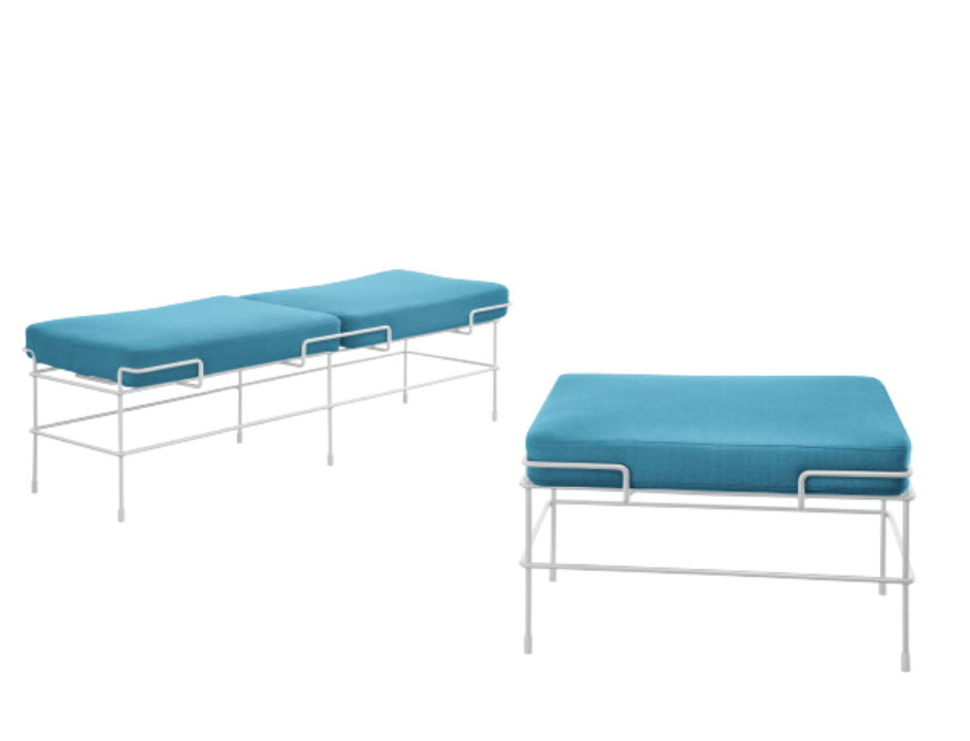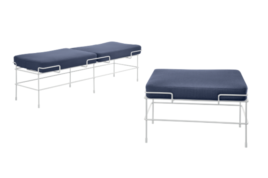 To ławka posiadająca materiałowe poduszki jako siedziska, które pomieszczą dwie osoby dorosłe.