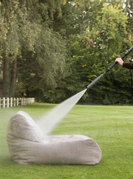 Meble z puf można myć za pomocą węża ogrodowego lub myjki wysokociśnieniowej.