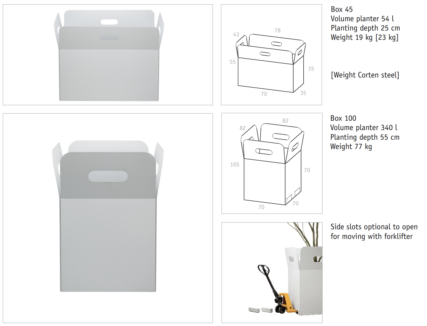 Te donice przypominające swym kształtem otwarte pudełko, są dostępne w 2 standardowych kolorach i kilku rozmiarach. Opcje te umożliwiają różnorodną i ciekawą aranżację przestrzeni zewnętrznej.