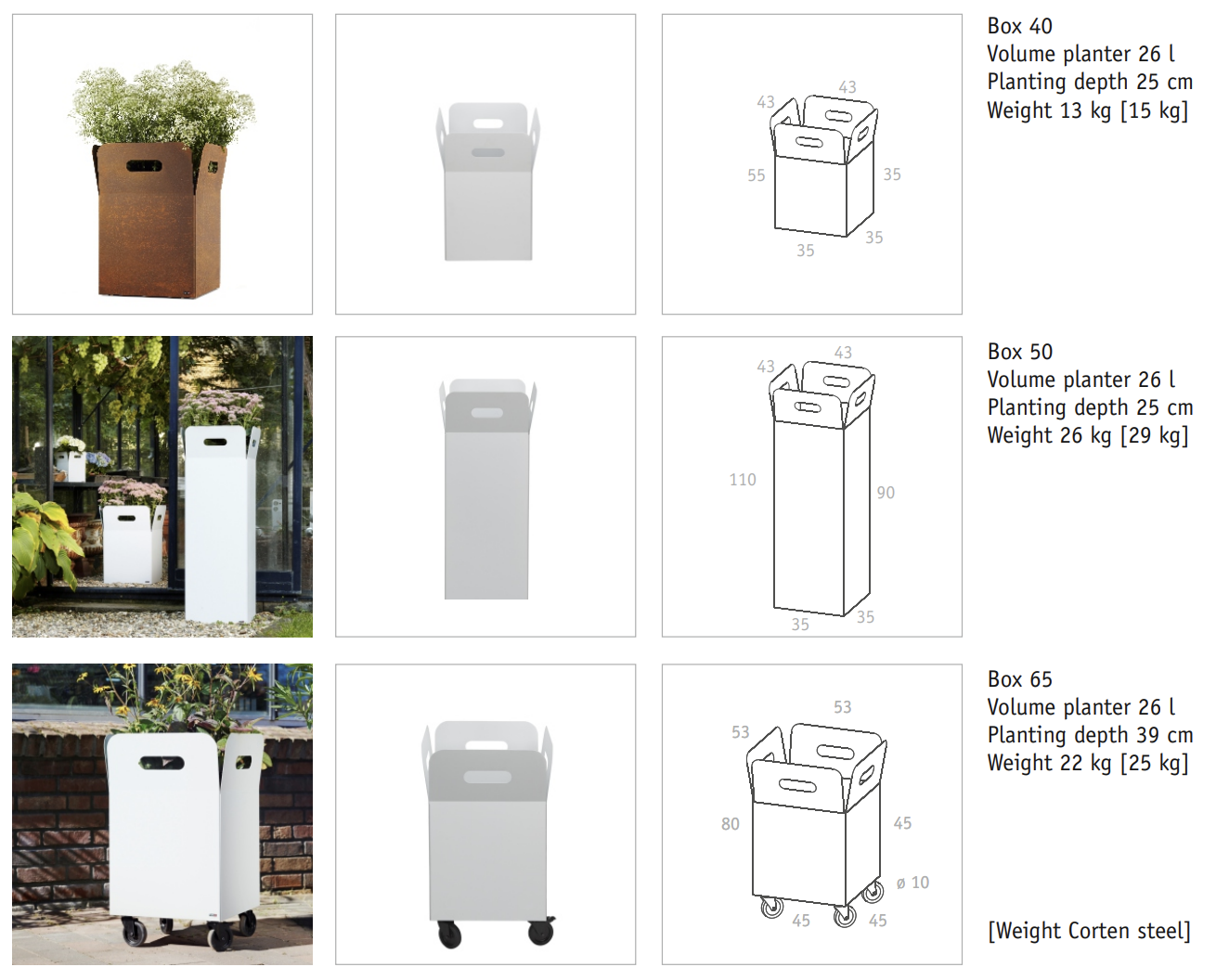 Donice Box występują w 2 wersjach: metalowej malowanej na biało i stali Corten.