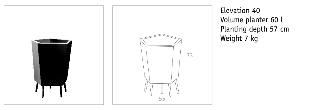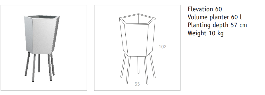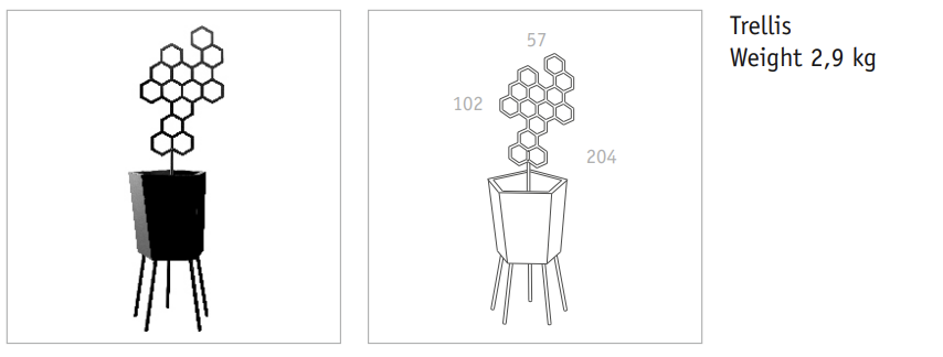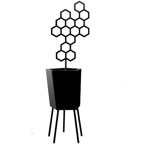 Donica Elevation z trejażem ma kształt pięciokąta. Zamawiając ten produkt otrzymujecie Państwo donicę metalową wraz z metalowym trejażem.