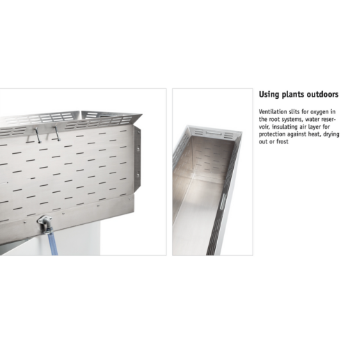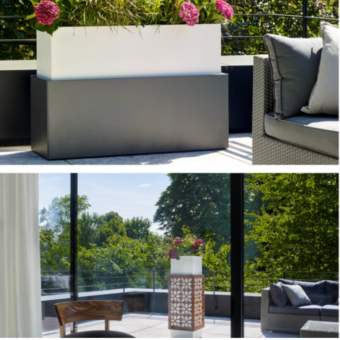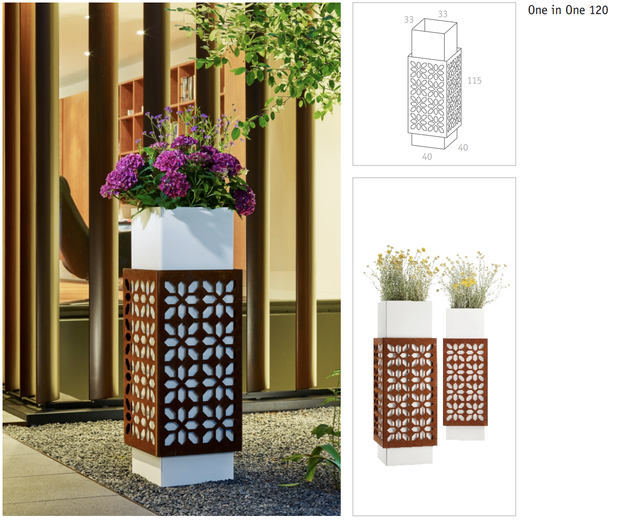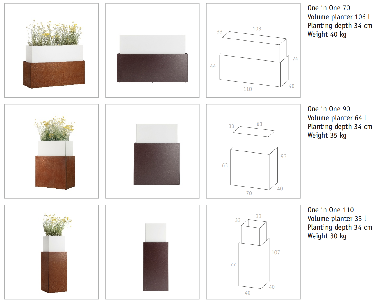 Odległość między wewnętrznym a zewnętrznym pojemnikiem zapewnia idealnie harmonijną sylwetkę. Donice One in One mają trzy różne rozmiary (wysokość i szerokość), ale zawsze tą samą głębokość (40 cm), co umożliwia różne ciekawe kombinacje, które budują lub akcentują przestrzeń zewnętrzną.