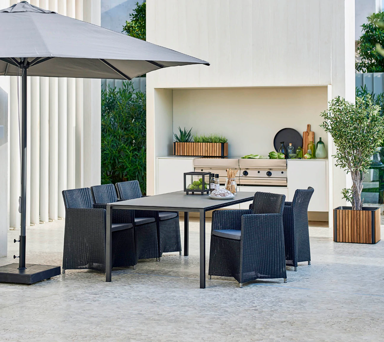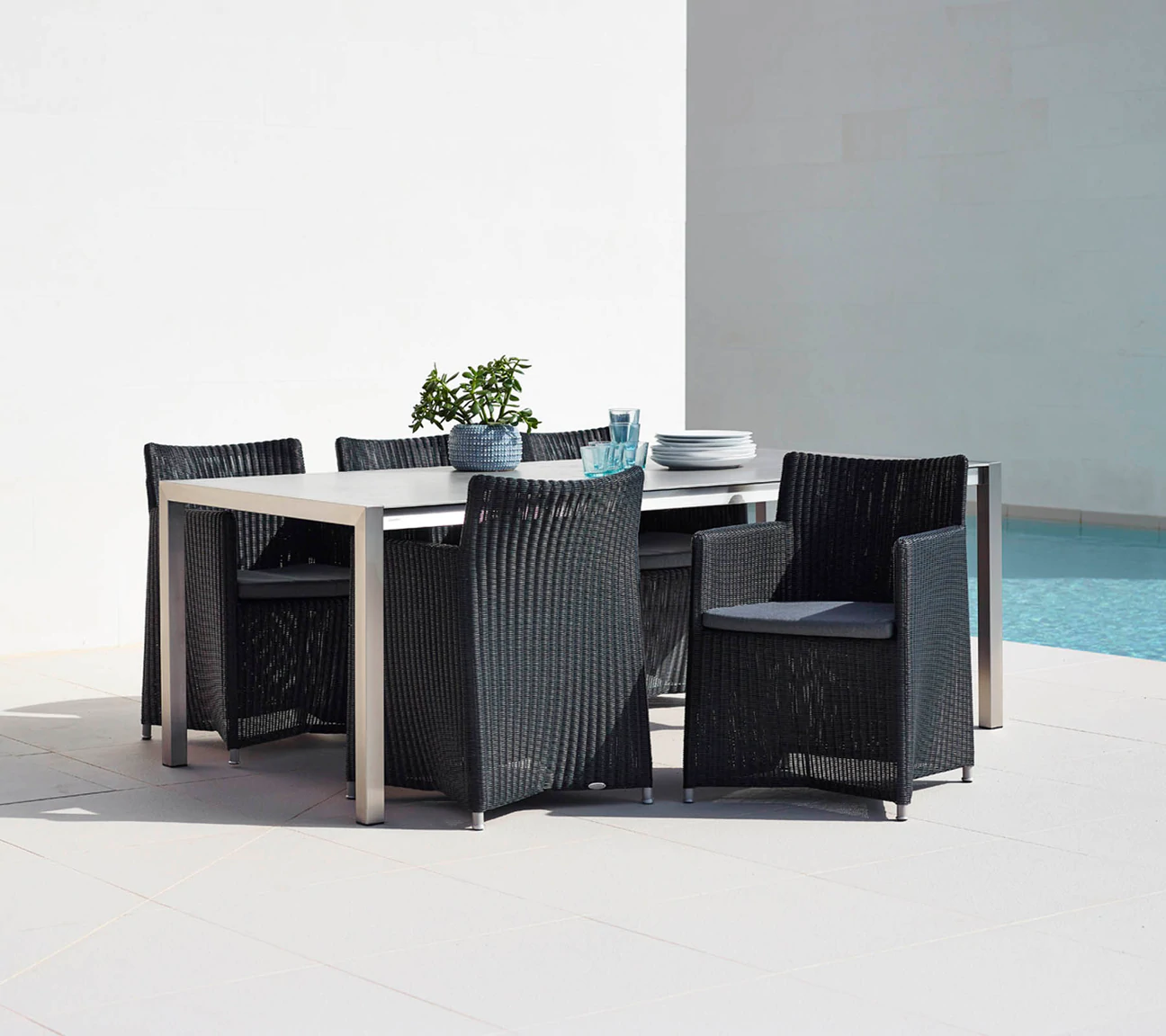 Skomponuj krzesła wraz z jednym z stołów obiadowych Cane-line i ciesz się piękną strefą jadalnianą na tarasie.