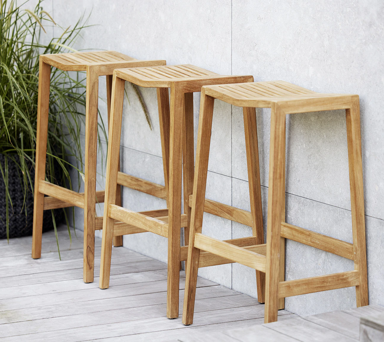 Krzesło barowe Flip posiada zgięcie na siedzisku tak by zapewnić dobry komfort siedzenia, i teakowa poprzeczkę by zapewnić odpoczynek nogą.
