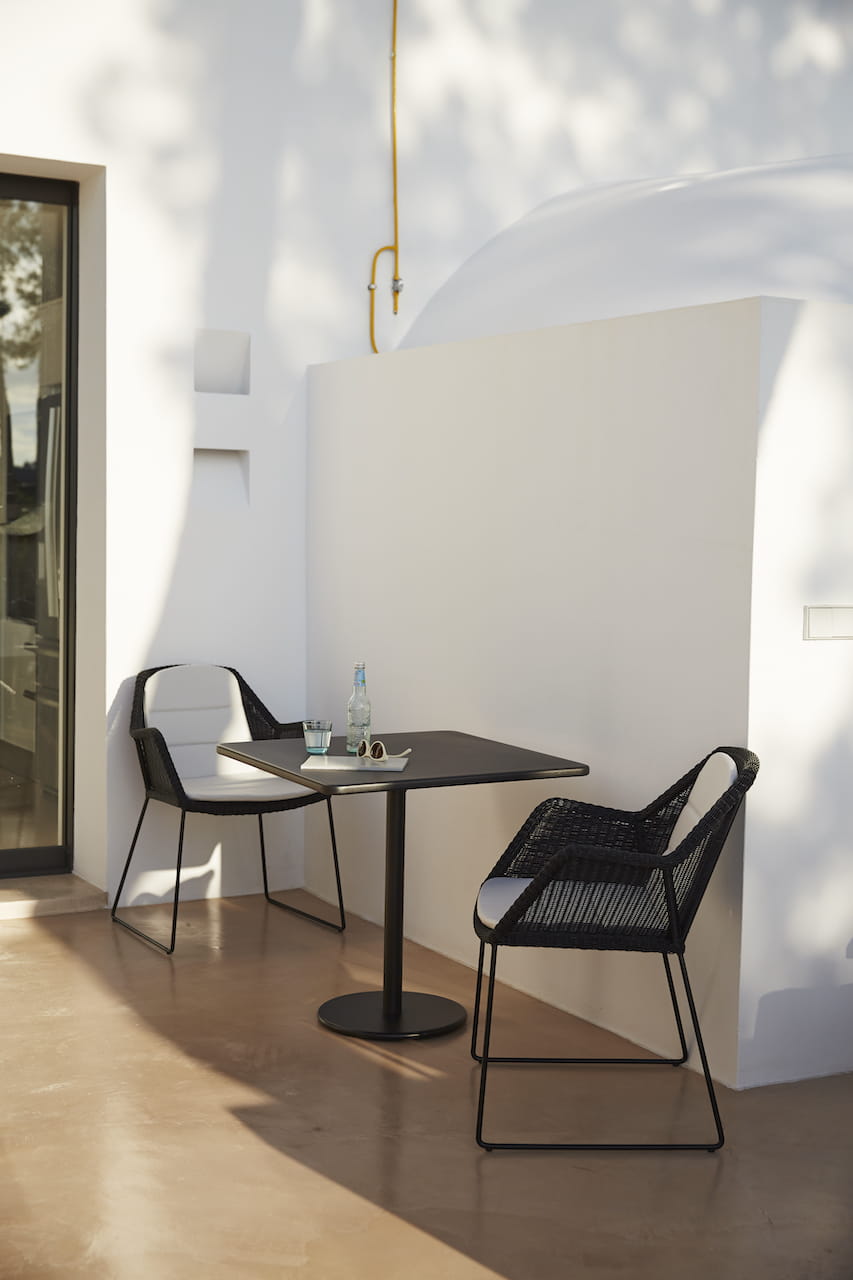 Ogrodowe krzesło stołowe Breeze jest dostępne w kolorze czarnym, białym, jasnym szarym i taupe Cane-line Weave®